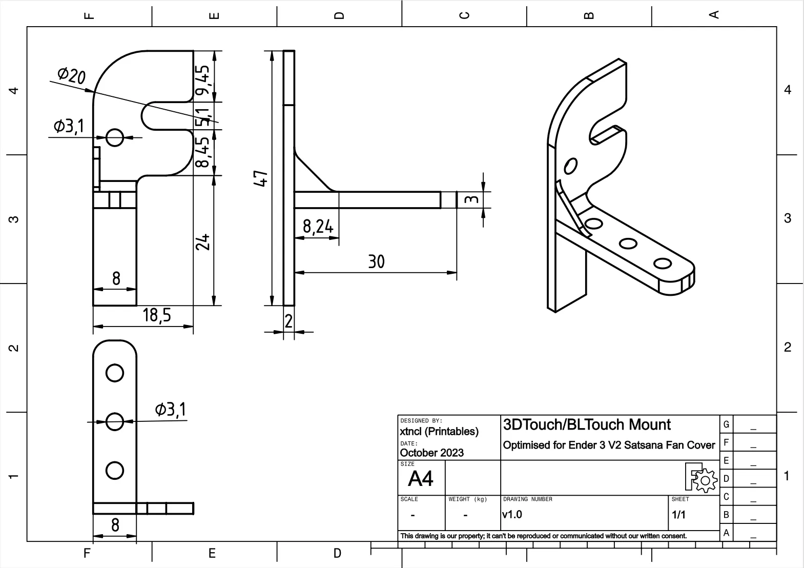 Giá treo 3D/bltouch sử dụng ít không gian hơn các giá treo khác. Tối ưu hóa cho bìa quạt Satsana (Ender 3 V2).