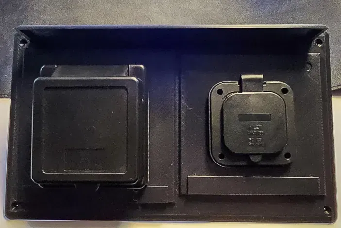 Đây là phiên bản khác của giá gắn cổng RV của tôi kết hợp cả giá 30 và 15-ampe. Lỗ 15-ampe cũng có thể chứa một cổng 20-ampe. Tôi đã lắp đặt một mạch 20-ampe để có thể kéo tổng cộng 50-ampe vào RV khi cần.