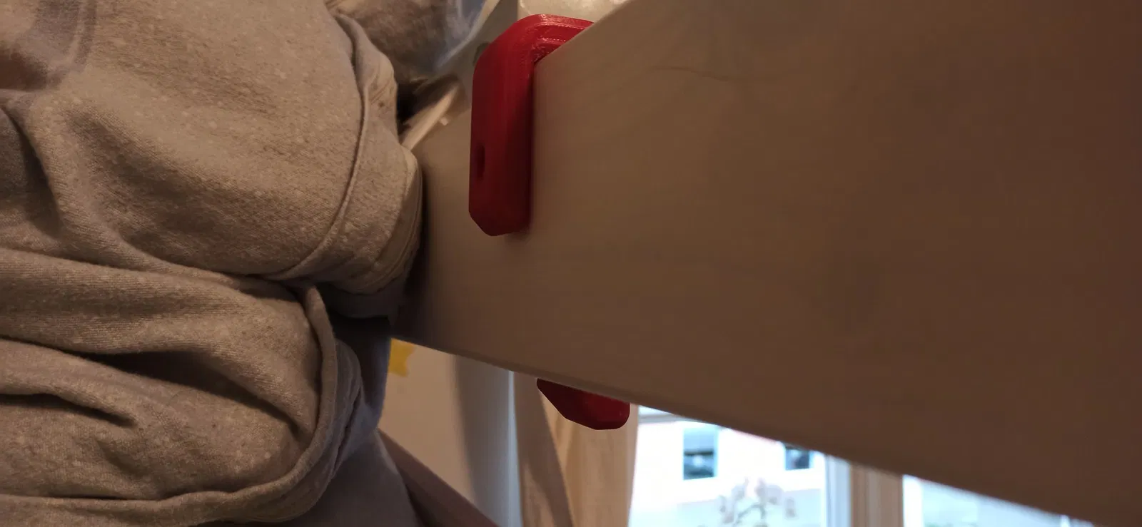 Để sử dụng đa năng, tôi cũng đã làm một móc với các lỗ khoan chìm. Tôi đã sử dụng hai cái trong số đó để gắn một kệ nhỏ hiện có vào thanh của giường.