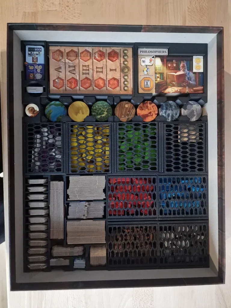 Tôi vẫn không hài lòng lắm với khay hình lục giác gốc và có thể sẽ remix nó nữa, bây giờ cũng có nhiều không gian trống chưa sử dụng hơn (có thể sẽ đủ cho việc mở rộng trong tương lai, bạn có thể in các tấm ngăn hoặc không, tùy bạn chọn).