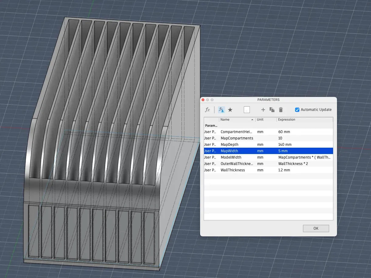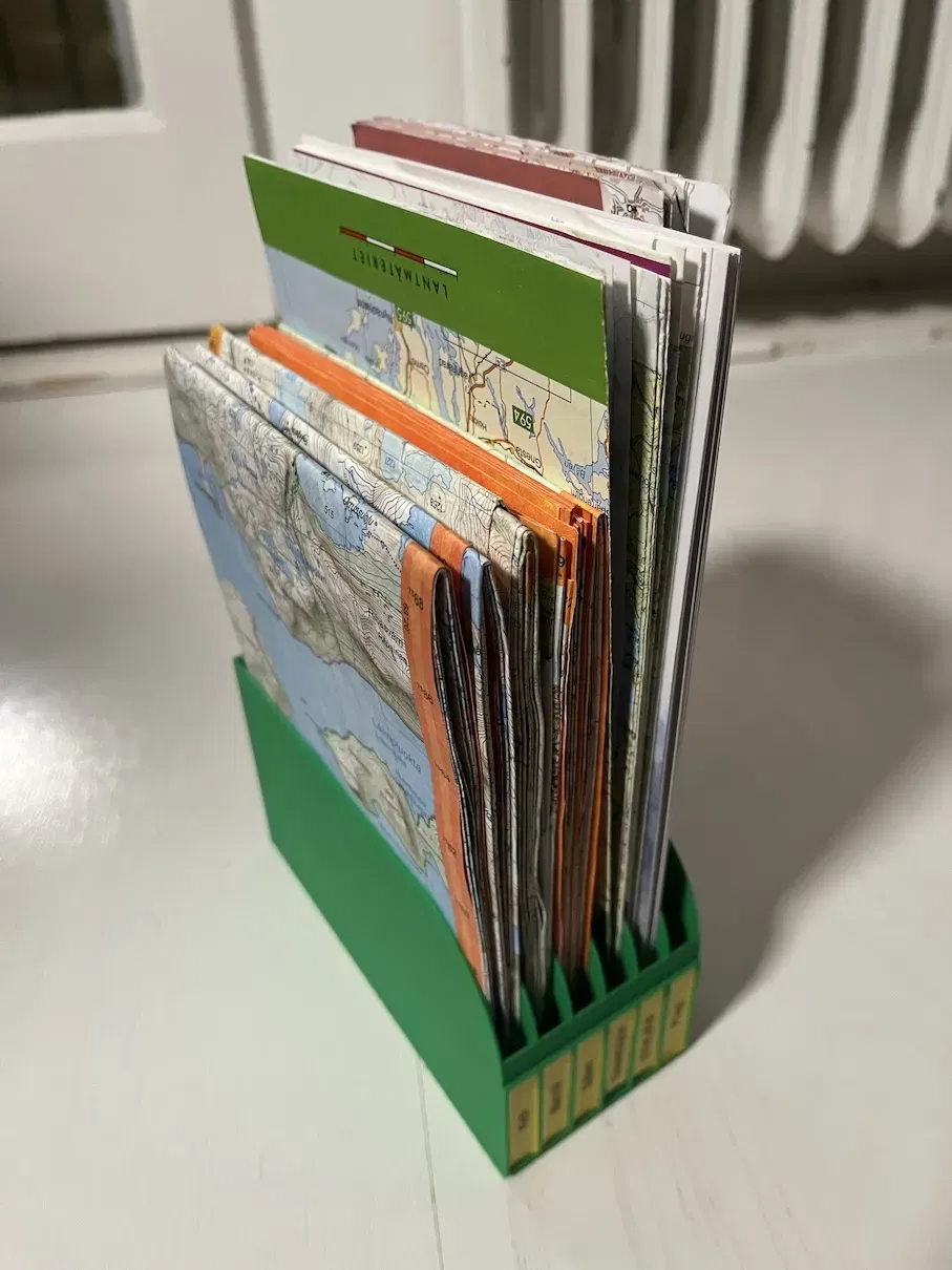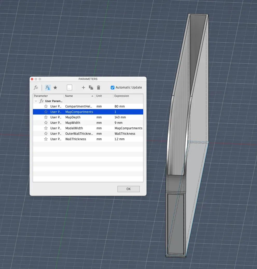 Đây là một thư mục lưu trữ cho các bản đồ ba lô gấp, nếu bạn có Fusion 360 bạn nên có thể chỉnh sửa các tham số của nó để phù hợp với nhu cầu của bạn, cũng có một STL để in một thư mục có tường mỏng (tường 1.2mm, cả bên ngoài và bên trong) với không gian cho 6 bản đồ vừa với một ngăn mở 9mm*140mm (nó cao 80mm, cho phép các bản đồ của tôi đứng chủ yếu thẳng đứng).