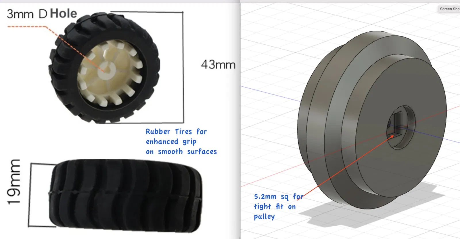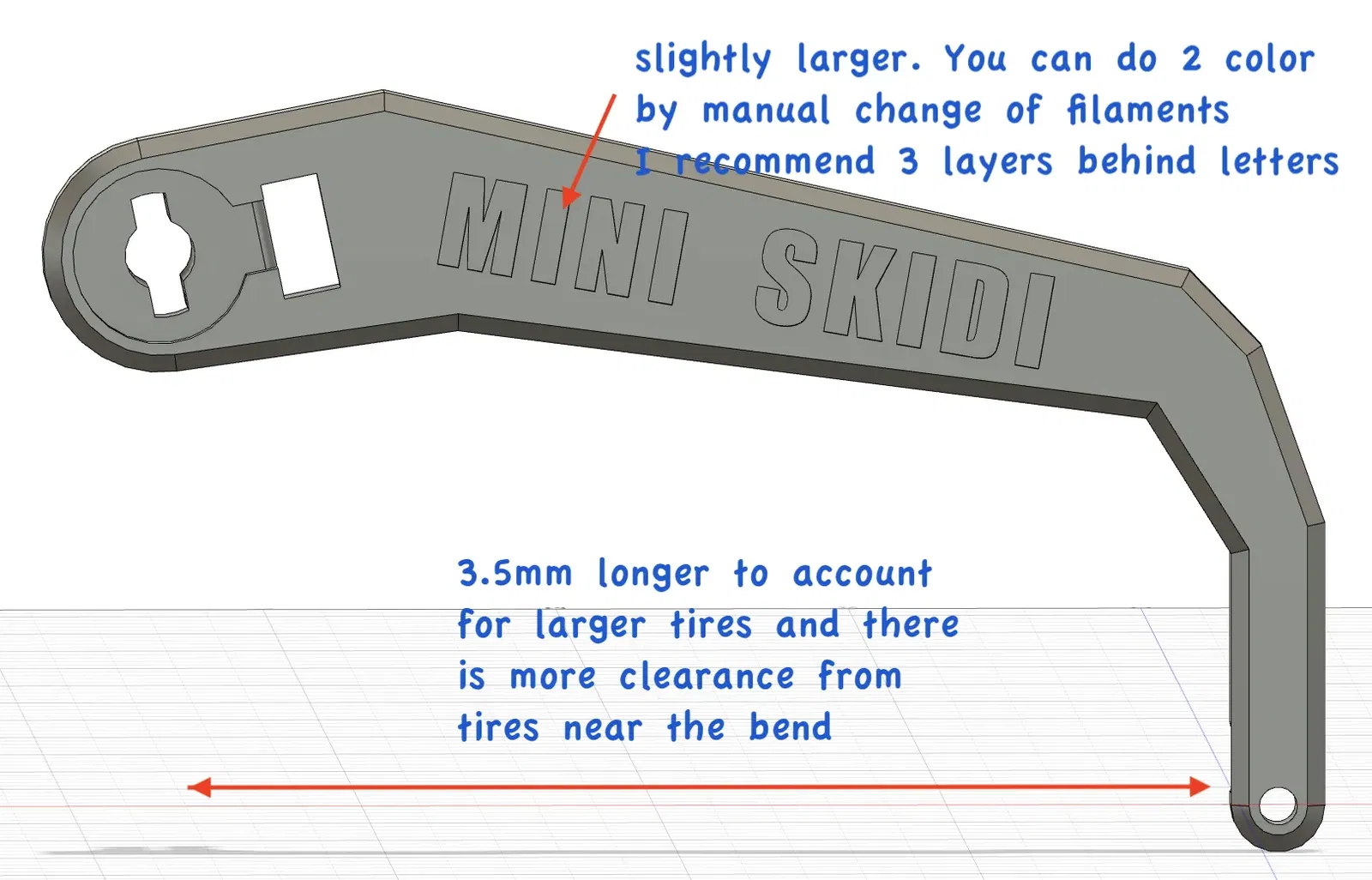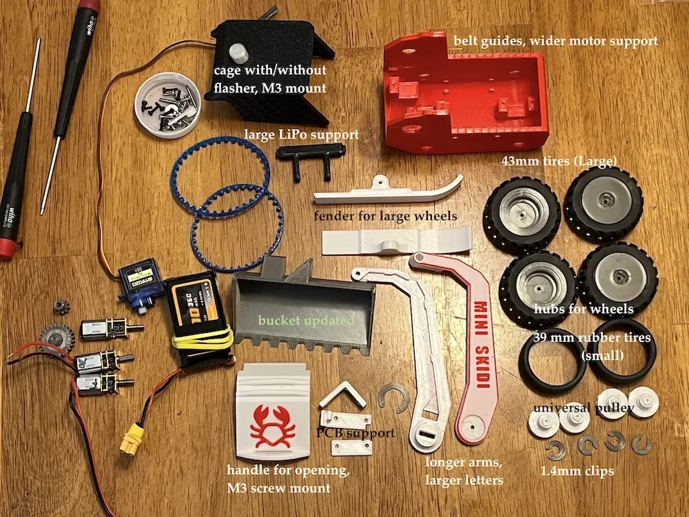 Tôi đã thêm V2 cho nhiều bộ phận. Những cái này đã tăng độ sâu của kết nối vuông giữa các ròng rọc & ổ trục bánh xe; và giữa bánh răng cánh tay và cánh tay trái. Các bánh răng cánh tay có răng rộng hơn để làm cho chúng mạnh hơn khi khớp nhau. (In phần trên của bánh răng cánh tay ở độ cao lớp 0.1mm) Cái chắn bùn cung cấp nhiều khoảng trống hơn cho lốp cao su lớn. Cập nhật 17 tháng 9, '23: Tôi đã phát hiện ra rằng các răng của xô bị mắc kẹt nếu bạn sử dụng một điểm dừng để đẩy một vật vào, để bạn có thể nâng nó lên. Tôi đã sửa đổi xô để các răng không còn có thể đi dưới một điểm dừng như vậy. Điều này sẽ ngăn chặn servo xô và/hoặc động cơ tay nâng quá tải. Xem các hình ảnh ở trên để so sánh. Xô này có cùng lỗ gắn để hỗ trợ kẹp nguyên bản. V2 hiện hỗ trợ một servo bánh răng kim loại có thân dài hơn 2mm so với loại nhựa. Cập nhật: 16 tháng 9, '23: Tôi đã thêm một tính năng theo dõi pin cho các SKIDIs của tôi. Mặc dù không cần các bộ phận in 3D, tôi đã thêm một tệp PDF mô tả phần cứng và phần mềm cung cấp tính năng này. Hiện tại, tôi sử dụng cả đèn LED tích hợp trên CPU và đèn nhấp nháy trên mái lồng để cung cấp chỉ báo trạng thái pin (1 đến 5 lần nhấp) và để cung cấp trạng thái khi pin quá thấp và cần được sạc lại. HIỆN TẠI ở V2. Cập nhật: 11 tháng 9, '23: Đã thêm một đèn LED nhấp nháy màu đỏ vào đỉnh của lồng. Xem bên dưới để biết chi tiết Cập nhật: 10 tháng 9, '23: Một số nhà chế tạo đã gặp sự cố gãy trục tay phải trên mẫu nguyên bản. Tôi chưa bao giờ gặp vấn đề đó, nhưng đã thêm hỗ trợ trục bổ sung cho tay phải và sửa đổi vỏ để chấp nhận trục có đường kính lớn hơn một chút của tay phải. Tôi cũng đã thêm hỗ trợ cho một bánh xe cao su nhỏ hơn (38mm) không yêu cầu các tay dài hơn hoặc chắn bùn cao hơn. (mặc dù các tay dài hơn cho phép một phạm vi khớp nối rộng hơn của xô). Xem video bên dưới. Cập nhật: 30 tháng 8, '23: Tôi đã thêm một ròng rọc đa năng với lỗ trục rộng hơn một chút. Một số người phàn nàn rằng họ đã làm hỏng động cơ N20 của mình khi cố gắng lắp đặt nguyên bản. Điều này do máy in đã xuất quá mức một chút và lỗ quá nhỏ. Ròng rọc đa năng 'rộng' tăng kích thước trục từ 3.15mm lên 3.35mm. **************************************************************************************************** Nếu bạn muốn sử dụng lốp cao su lớn hơn, bạn sẽ cần sử dụng các cánh tay dài hơn và các vè cao hơn. Một bánh xe cao su nhỏ hơn, (xem hình ảnh để biết thông tin đặt hàng và video bên dưới) có độ bám ít hơn so với lốp cao su lớn, nhưng nhiều hơn so với TPU. Nó quay mà không có bất kỳ ‘nhảy’ nào và là một sự thỏa hiệp khá tốt giữa TPU và bánh xe lớn hơn có độ bám rất tốt. Tuy nhiên, bánh xe lớn hơn thì là một ‘quái vật’ thực sự cho địa hình! Các cánh tay dài hơn cũng hoạt động tốt với các bánh xe cao su nhỏ hơn. Video bên dưới cho thấy 2 loại lốp khác nhau và hiệu suất của chúng, cũng như hoạt động của cánh tay với các động cơ có tùy chọn RPM khác nhau. Nó cũng chứng minh tính năng ‘phanh’ của các bộ điều khiển động cơ H-Bridge. Một giá đỡ pin lớn hơn cũng được giới thiệu. Bản remix này sử dụng một “pulley” hoặc trục truyền động “đồng nhất” trên tất cả các bánh xe, và được thiết kế cho vỏ bọc đi kèm. Pulley ở đây được thiết kế để cung cấp khả năng kết hợp tốt hơn của dây đai TPU. Các thiết kế được phát hành đầu tiên có xu hướng bị lệch khỏi pulley, nhưng tôi nghĩ rằng điều đó đã được cải thiện rất nhiều. Các cánh tay mới chỉ cần thiết để cung cấp khoảng trống cho các lốp lớn hơn mới. (nhưng hoạt động tốt với các lốp nhỏ hơn) Nắp và lồng là tùy chọn, và bây giờ được gắn bằng một vít M3 x 10 đầu phẳng ở mỗi bên. Nắp có một tay cầm để dễ dàng mở và có logo của tôi (tôi không thể cưỡng lại). Đây là một video để giúp những ai có thể gặp khó khăn trong việc lấy khách hàng tiềm năng về các động cơ N20 hoặc lắp đặt các bộ phận của dây curoa. Điều này KHÔNG được trình bày bằng cách sử dụng vỏ đã chỉnh sửa của tôi với các hướng dẫn dây curoa vì tôi không có một cái in thêm vào thời điểm đó. Với vỏ của tôi, dây curoa giữ thẳng hàng tốt hơn, nhưng nó cũng bị mắc vào cột hướng dẫn khi bạn lắp động cơ, và bạn sẽ cần một cái nhíp cong nhỏ để kéo dây curoa lên và quanh cột hướng dẫn để nó nằm sát vào tường vỏ khi bạn hạ động cơ vào vị trí hỗ trợ của nó. Cập nhật Flasher: Tôi đã thêm hỗ trợ cho việc gắn một đèn LED nhấp nháy lên mái của lồng. Tôi đã sử dụng một đèn LED nhấp nháy đỏ 5mm (kính đỏ). Tôi đã thiết kế một vỏ flasher bằng cách sử dụng filament trong suốt. In với chỉ 1 đường viền để cầu nối không bị chùng. (0.2layer 5walls top/bottom) Có 2 phiên bản của lồng. Một cái 