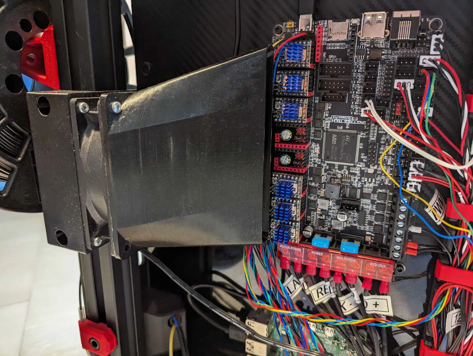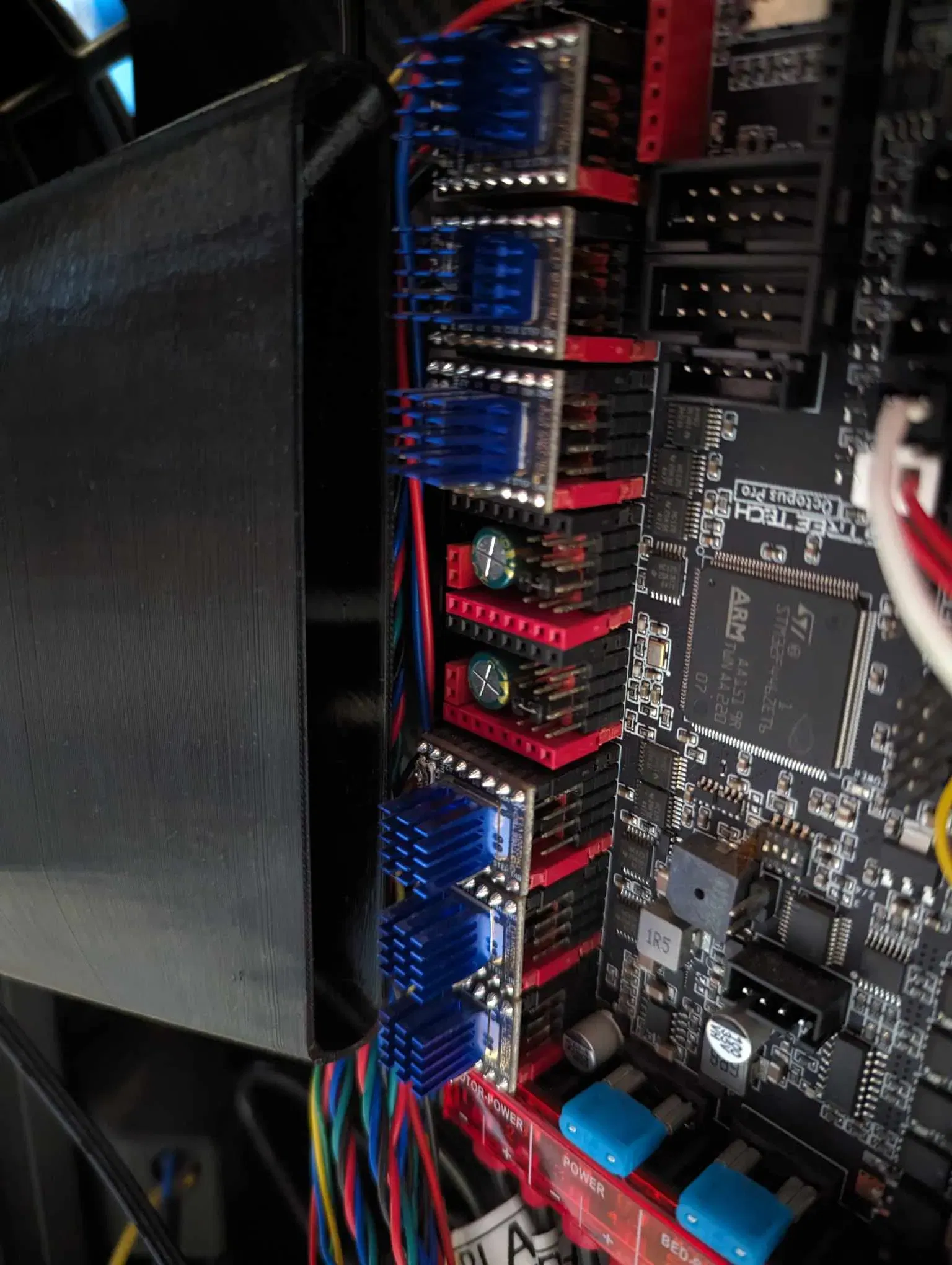 Tôi đã tạo ra một giá đỡ để đặt quạt 92mm theo chiều dọc ngay bên cạnh phần khung, và một ống dẫn hướng dòng khí ngay trên các bộ tản nhiệt octopus pro. Góc của ống dẫn đảm bảo rằng hầu hết dòng khí đi qua các driver X, Y, E, với phần còn lại sẽ hướng tới các driver Z.