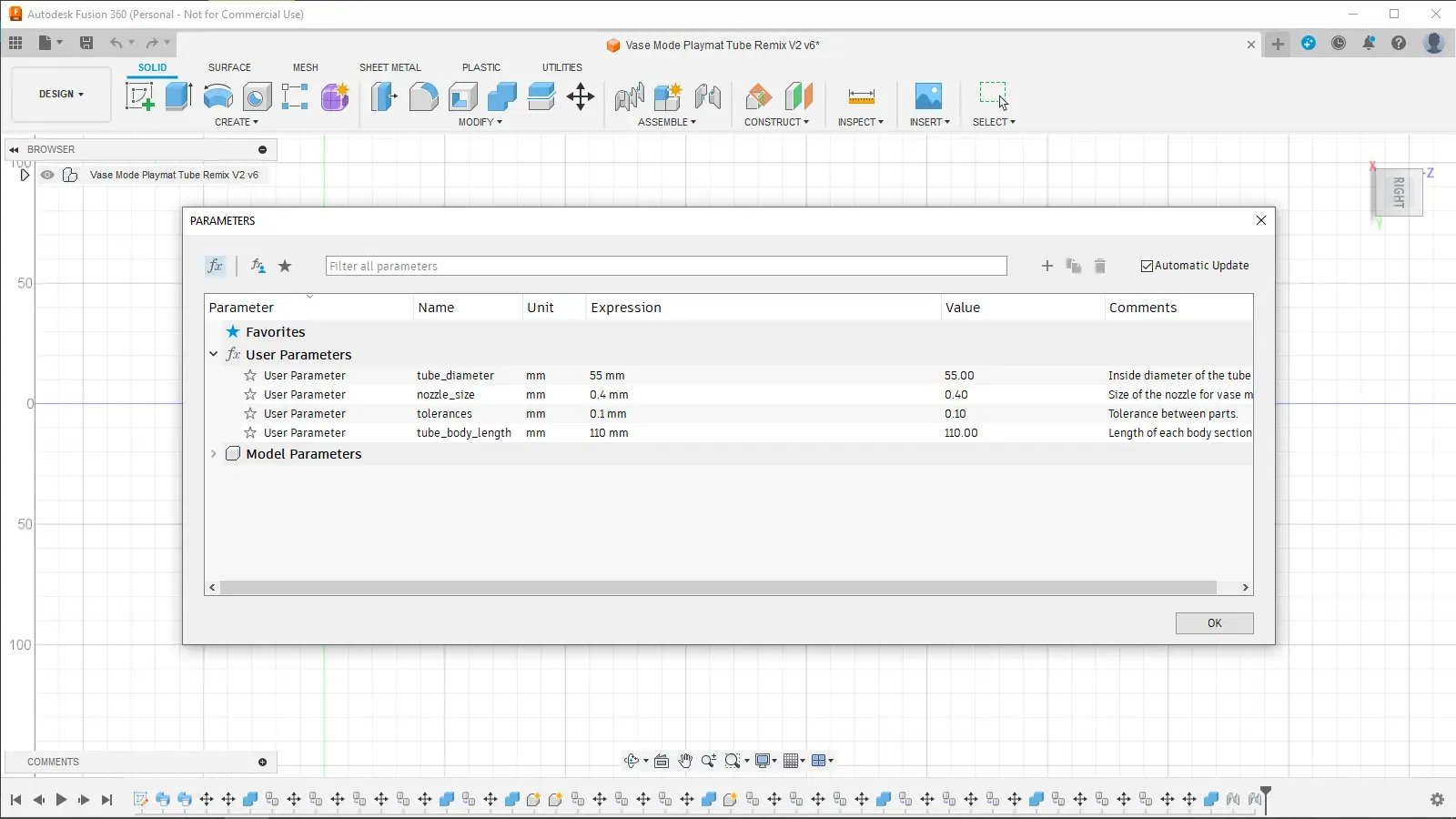 Các tham số có thể điều chỉnh trong cửa sổ tham số trong Fusion 360. Tôi đã kiểm tra một số kết hợp đường kính và chiều dài, và chúng hoạt động mà không làm hỏng bất cứ điều gì, nhưng một số kích thước có thể yêu cầu điều chỉnh một số thao tác.