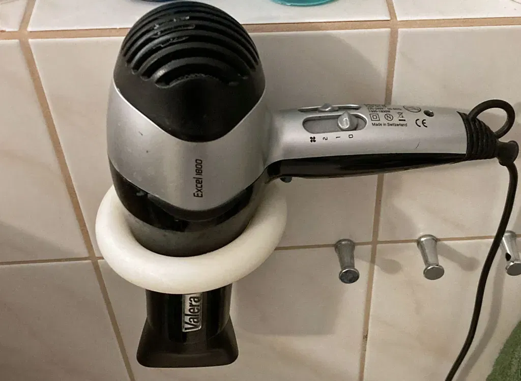 Một giá treo máy sấy tóc phù hợp với hầu hết các máy sấy tóc, nếu không thì có thể dễ dàng thay đổi kích thước.