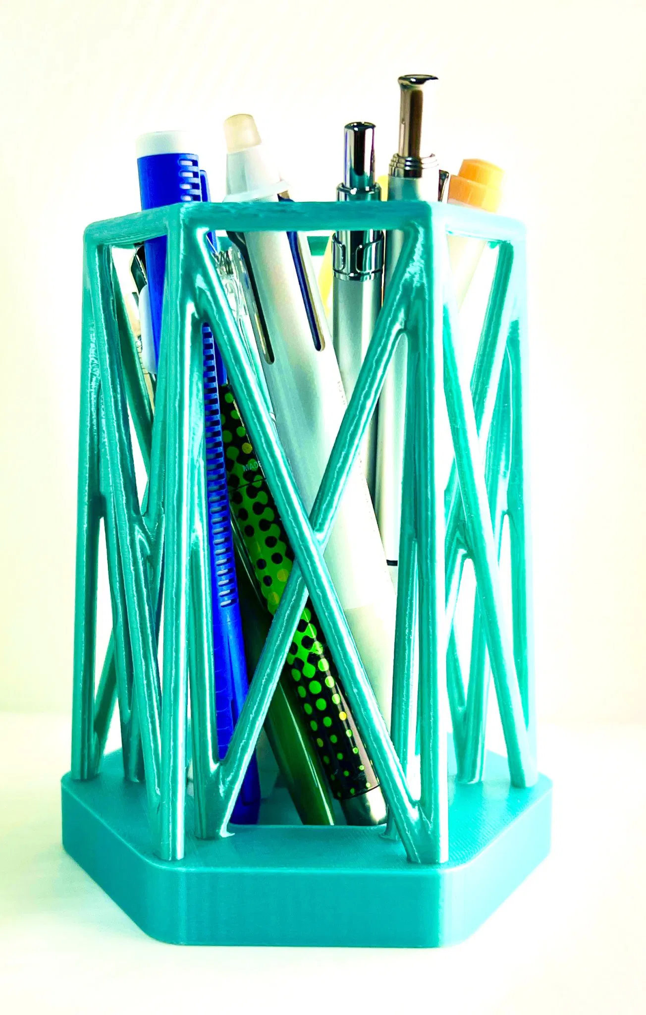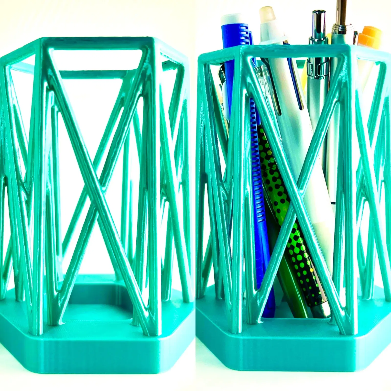Một cốc bút bắt mắt. Bản chất khung dây của nó được lấy cảm hứng từ các kết cấu khung dây trong trò chơi điện tử. Nó chứa một lượng bút và bút chì hợp lý. Cao 125mm. Không cần hỗ trợ, nhưng nếu máy in của bạn không thể xử lý các phần nhô ra, bạn có thể bật hỗ trợ.