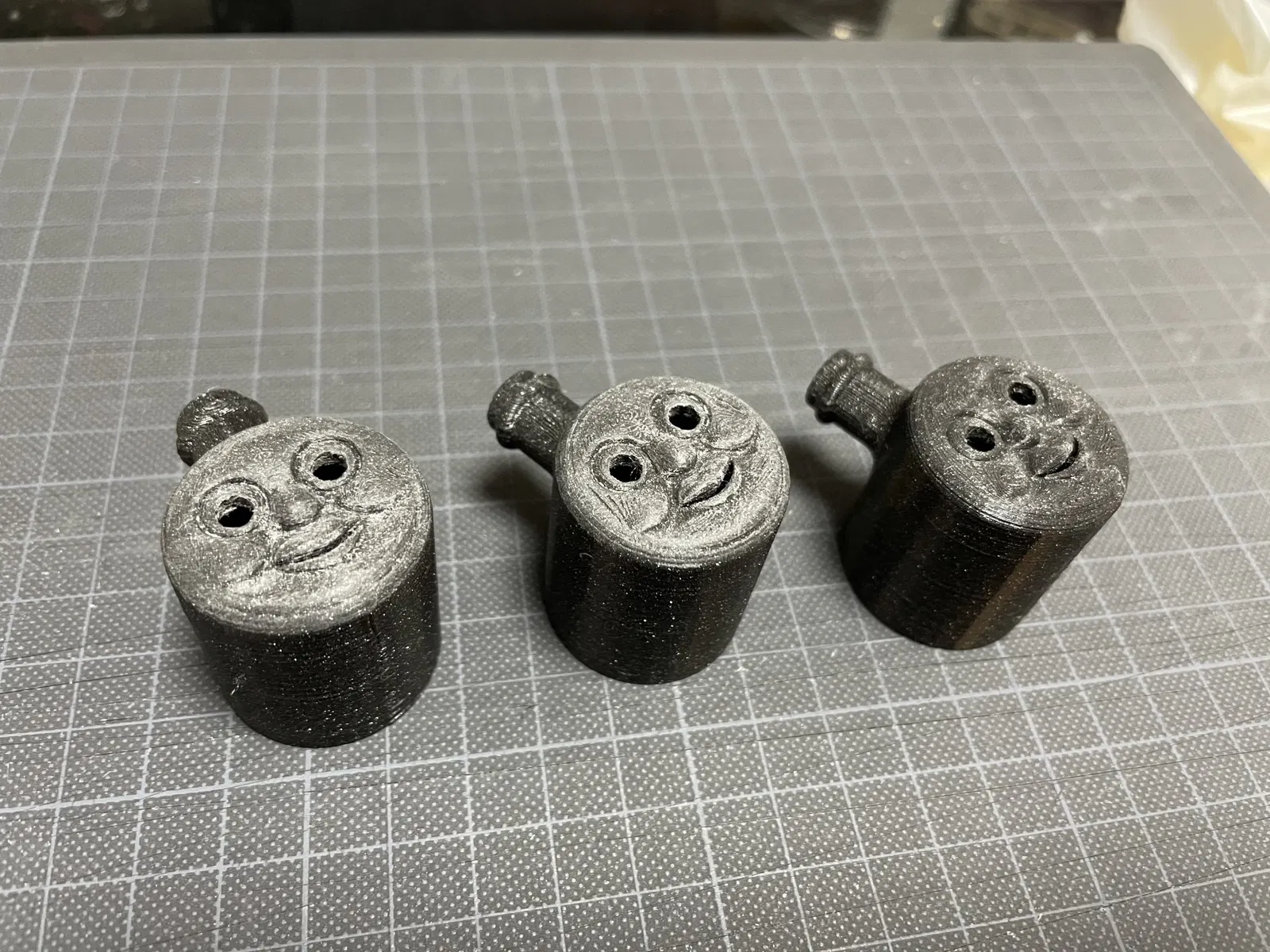 Tôi đã làm mịn viền bên ngoài của hình trụ, kéo dài thân và thêm ống khói, ống khói cũng rỗng, vì vậy chất lỏng có thể chảy ra từ ống khói cũng như các lỗ mắt và miệng!