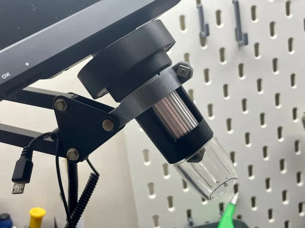 Kính hiển vi kỹ thuật số của tôi đi kèm với một đế kim loại tiện lợi, nhưng tôi nghĩ rằng tôi có thể sử dụng nhiều tính linh hoạt hơn và đã chọn một giá đỡ microphone có khớp nối.