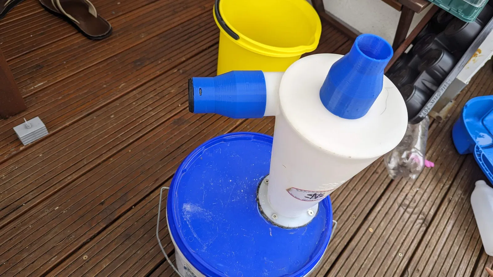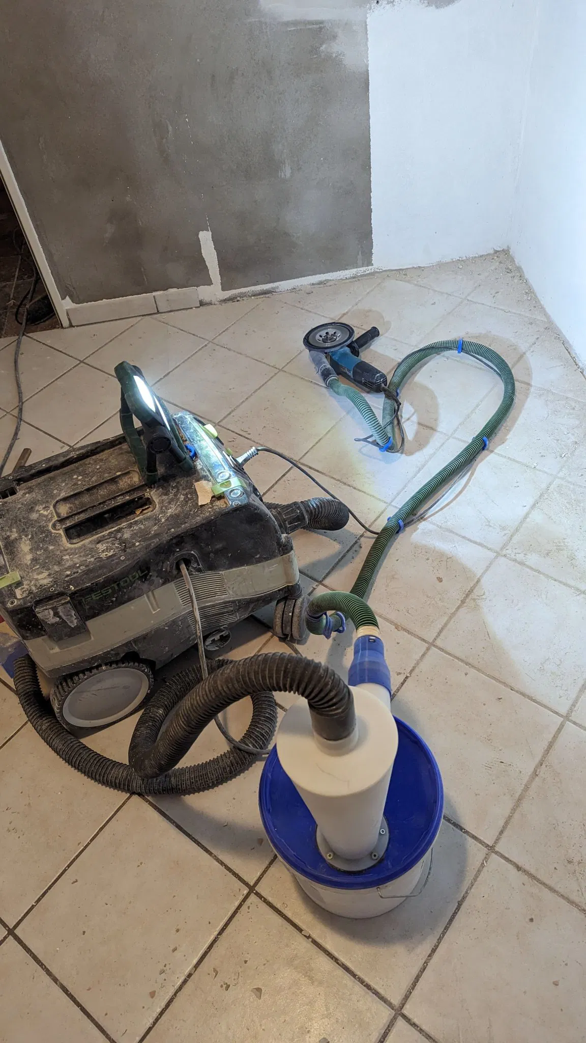 Mặc dù có túi tái chế, mà tôi có thể kết nối với máy hút bụi bằng một bộ chuyển đổi in 3D, nhưng việc mài bê tông và keo gạch của tôi tạo ra quá nhiều bụi đến nỗi việc làm rỗng túi mất nhiều thời gian hơn cả khoảng nghỉ mài. Đó là lý do tôi đã kết nối một bộ tách xoáy với máy hút bụi. Nó hoạt động rất tốt. Chỉ có một ít bụi mịn vẫn rơi vào túi và việc làm rỗng thùng thì nhanh chóng. Bộ tách có thể được kết nối trực tiếp với máy hút bụi bằng ống Festool gốc mà tôi có. Để kết nối bộ tách với máy, tôi đã phải thiết kế một đầu nối D27 với đường kính kết nối chính xác.