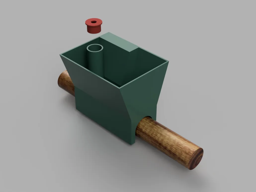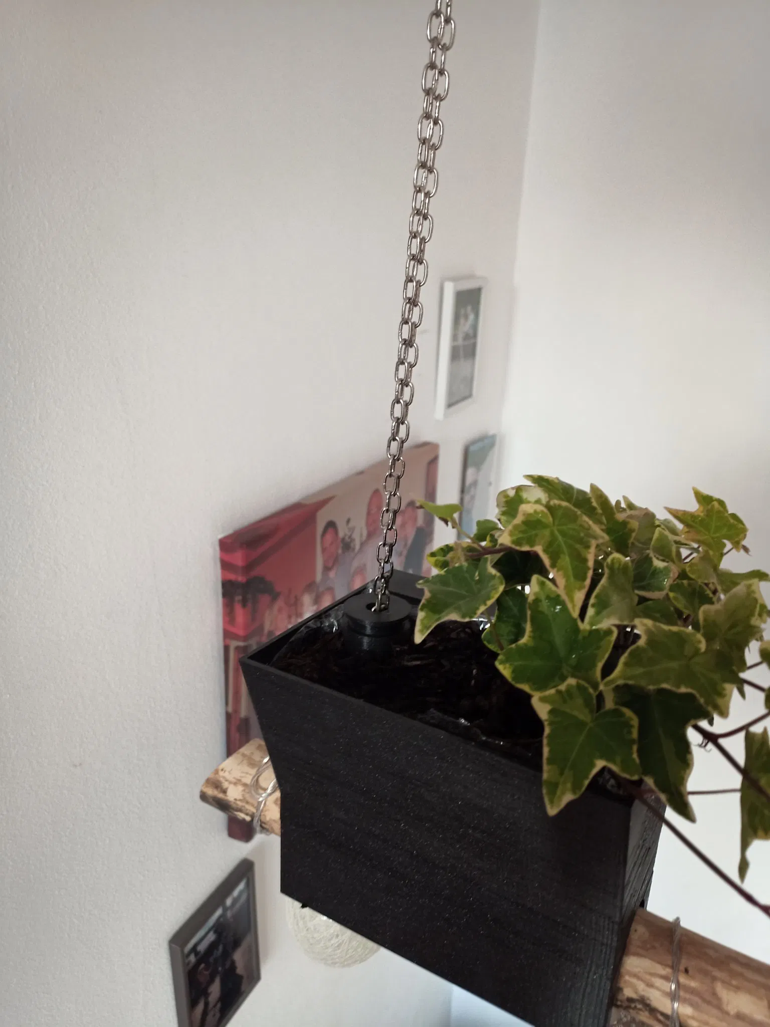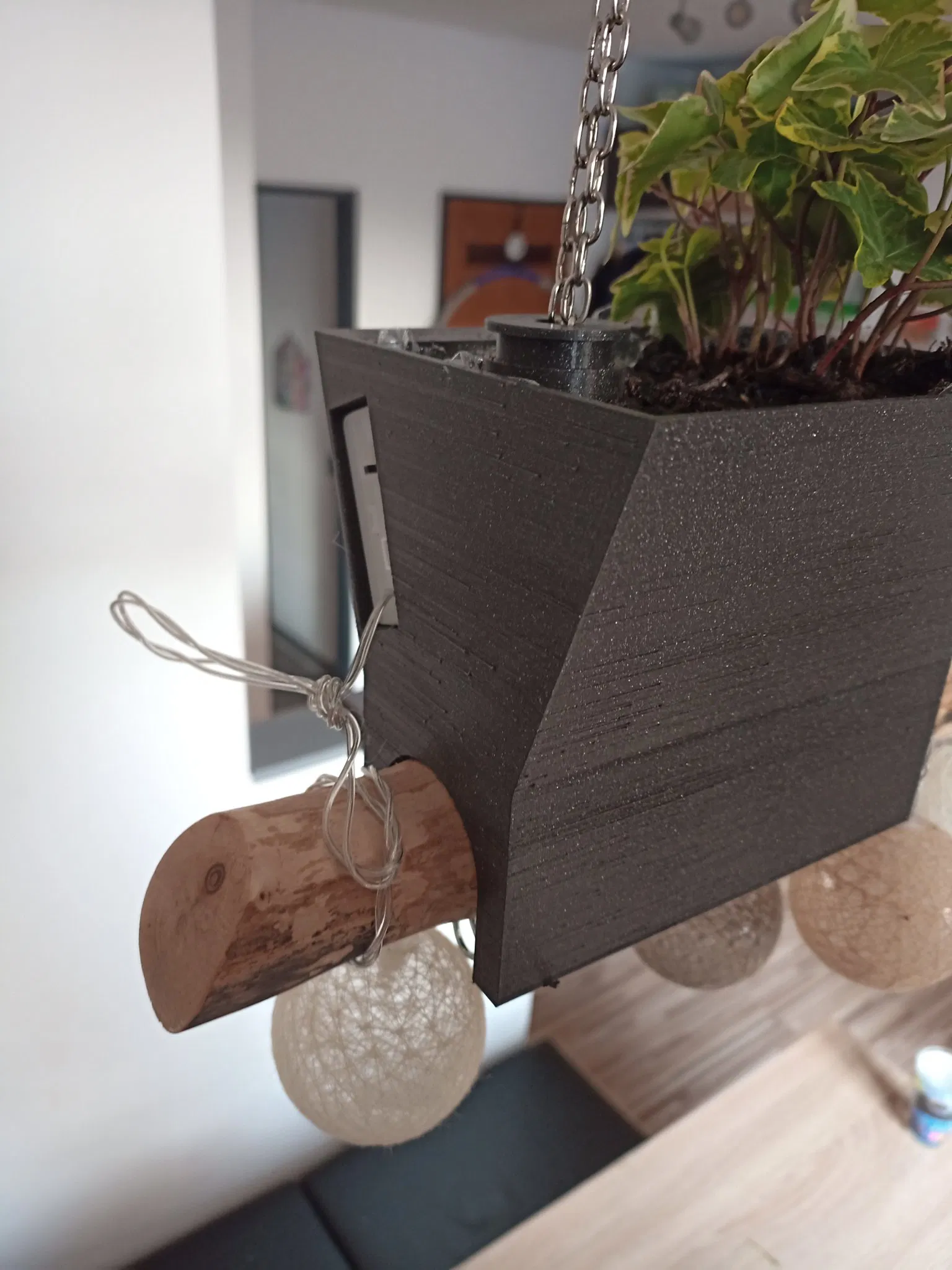 Chậu được thiết kế cho các thanh gỗ có đường kính lên đến 45mm. Tôi đã sử dụng khóa carabiner 10mm và một chuỗi nhỏ để gắn thanh vào trần. Nắp căn chỉnh giữ cho chậu đứng thẳng bằng cách giữ chuỗi như đã thấy trong các bức ảnh.