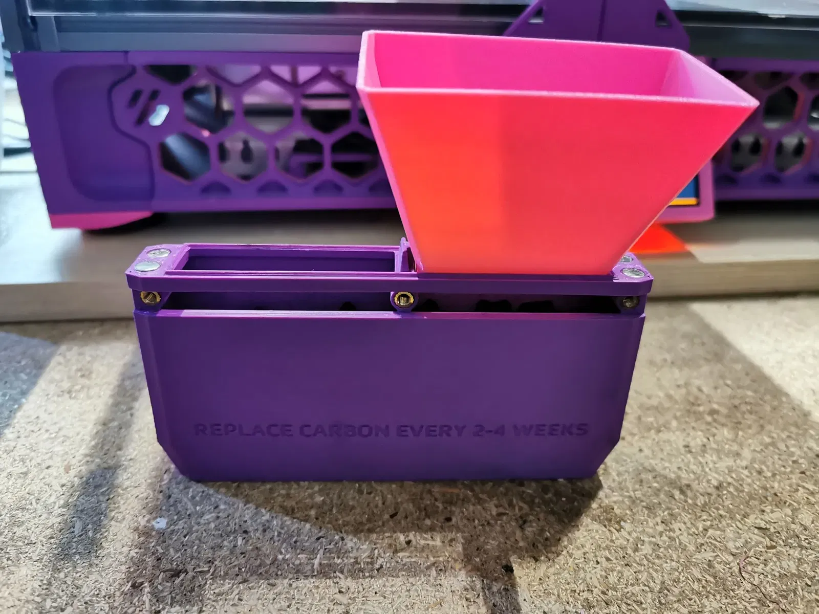 Một cái phễu đơn giản (cùng với một chiếc cốc bonus) được thiết kế để cho than vào cartridge NeverMore Micro V6 Easy Mod của Flying Gyroscope. Chất liệu: bất kỳ Hỗ trợ: không có Chiều cao lớp: 0.2 Vòi phun: 0.4 hoặc 0.6 Viền: được khuyến nghị