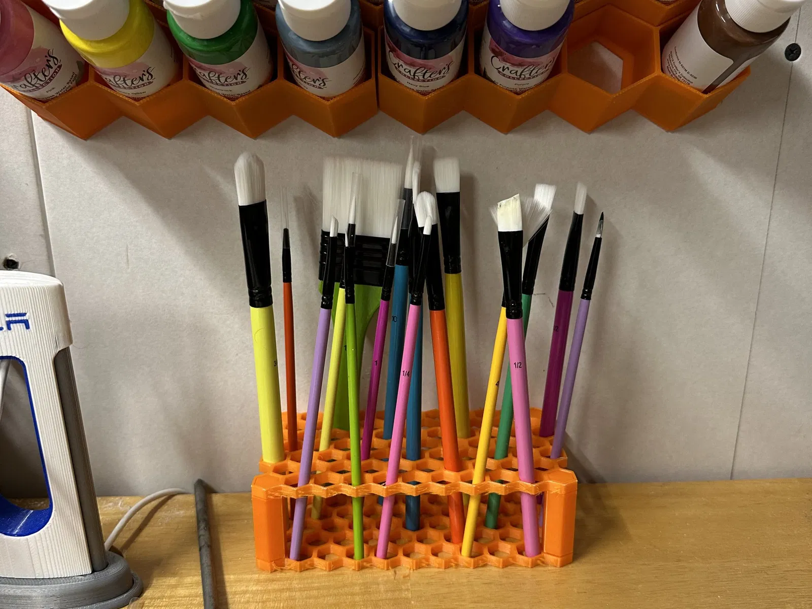 Giá đỡ cọ vẽ dựa trên hình tổ ong này có thể chứa tới 64 cọ vẽ với tay cầm dày tới 12mm, và 4 cái rộng tới 1.5 inches.