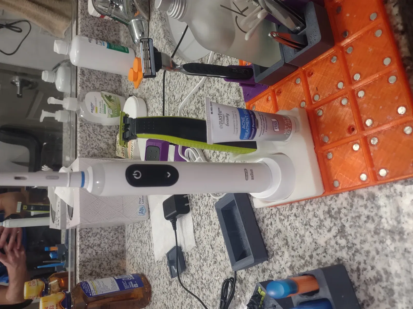 Giữ một bộ sạc OralB và bàn chải đánh răng cũng như một máy cạo Philips oneblade và một tuýp kem trị mụn.