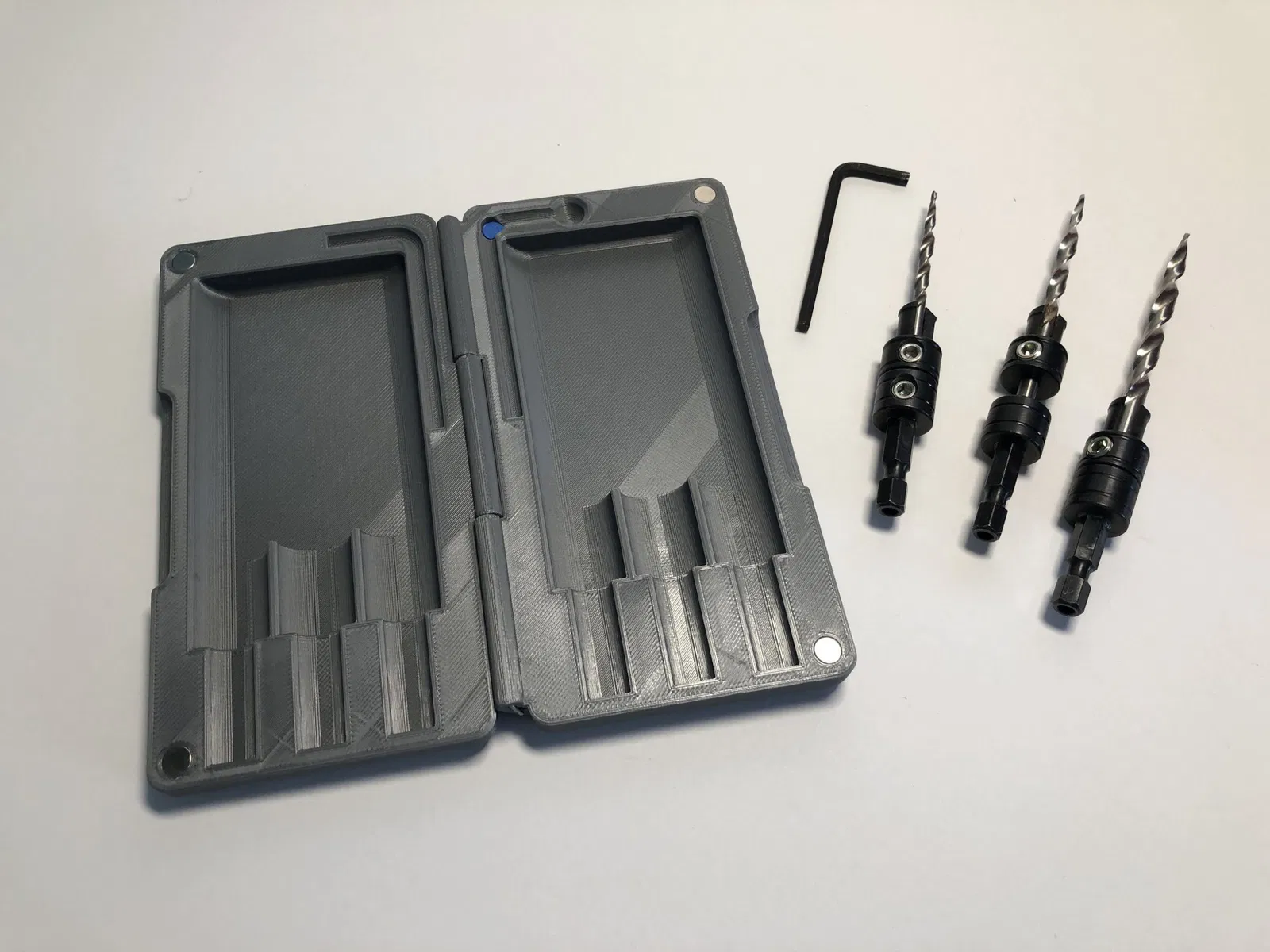 Case được thiết kế cho các mũi khoan countersink tapered Hex Shank của Snappy Tools (https://www.amazon.com/gp/product/B01ARZ4QC0/ref=ppx_yo_dt_b_search_asin_title?ie=UTF8&psc=1). Case đóng lại bằng nam châm và các mũi khoan được giữ bên trong bằng nam châm.