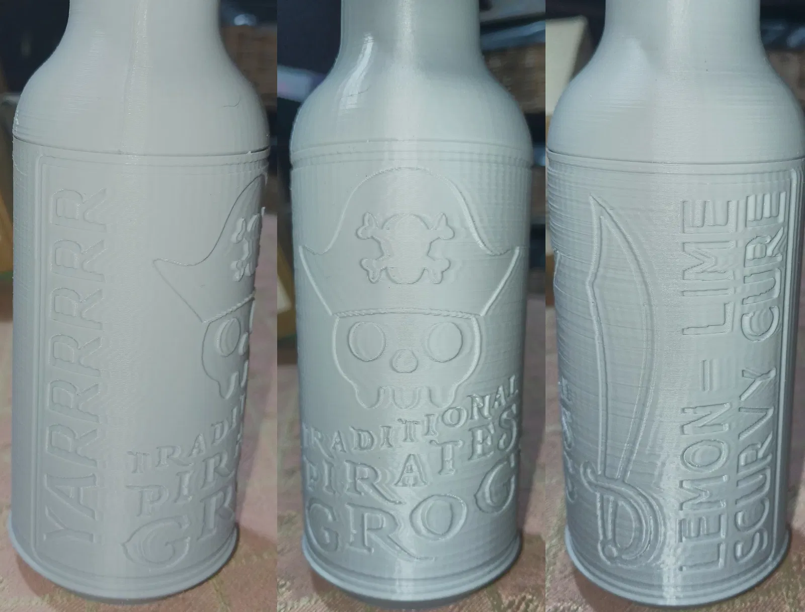 Đây là một chai soda của rượu grog hải tặc (Chanh chanh để tránh bệnh scorbut) mà bạn có thể sử dụng như một cái hộp giấu đồ. Việc in ấn khá nhanh mà không cần hỗ trợ gì cả. Không có gì tệ hơn một góc 45 độ ngoài dấu in. Một món đồ chơi thú vị có thể được sử dụng để lưu trữ đồ vật trong khi vẫn rất bền.