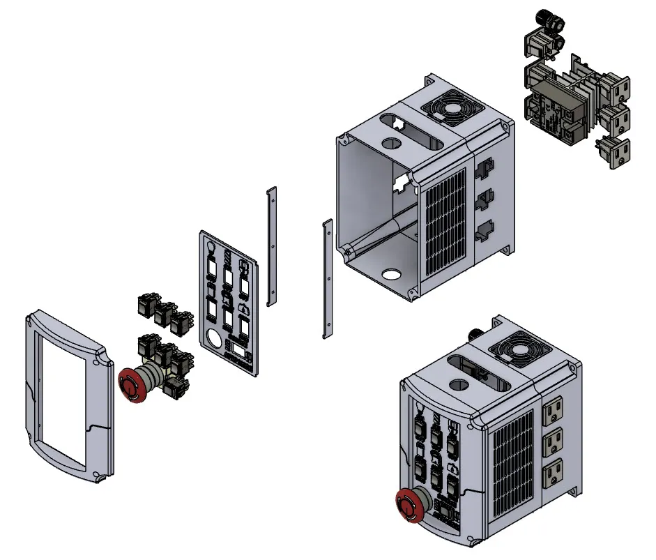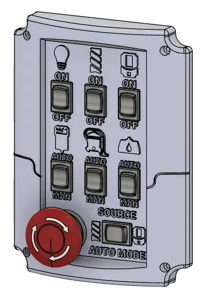 TÍNH NĂNG - Nguồn điện kép - Chính cho CNC, VFD và Ánh sáng - Phụ được điều khiển bởi SSR-Rơ le trạng thái rắn hoặc Thủ công khi vị trí công tắc là MAN - Ngắt khẩn cấp - Công tắc để điều khiển trạng thái Ánh sáng (Bật-Tắt) thủ công sử dụng nguồn điện chính - Công tắc để điều khiển CNC (Bật-Tắt) thủ công sử dụng nguồn điện chính - Công tắc để điều khiển VFD (Bật-Tắt) thủ công sử dụng nguồn điện chính - Công tắc để chọn nguồn điều khiển cho nguồn điện tự động. Người dùng có thể chọn CNC hoặc VFD. Tất cả công tắc được đặt ở «AUTO» sẽ được kích hoạt. - Công tắc để điều khiển Router (Tự động-Tắt-Thủ công) sử dụng nguồn điện phụ. - Công tắc để điều khiển Máy hút bụi (Tự động-Tắt-Thủ công) sử dụng nguồn điện phụ. - Công tắc để điều khiển Bơm (Tự động-Tắt-Thủ công) sử dụng nguồn điện phụ. - 6 ổ cắm điện