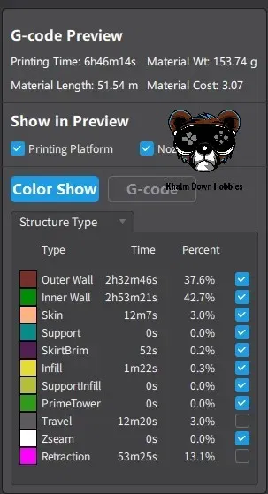 Việc in mất hơn 6 giờ trên K1 với các cài đặt mặc định, mất khoảng 154g vật liệu in và chỉ cần nhấp và đi.