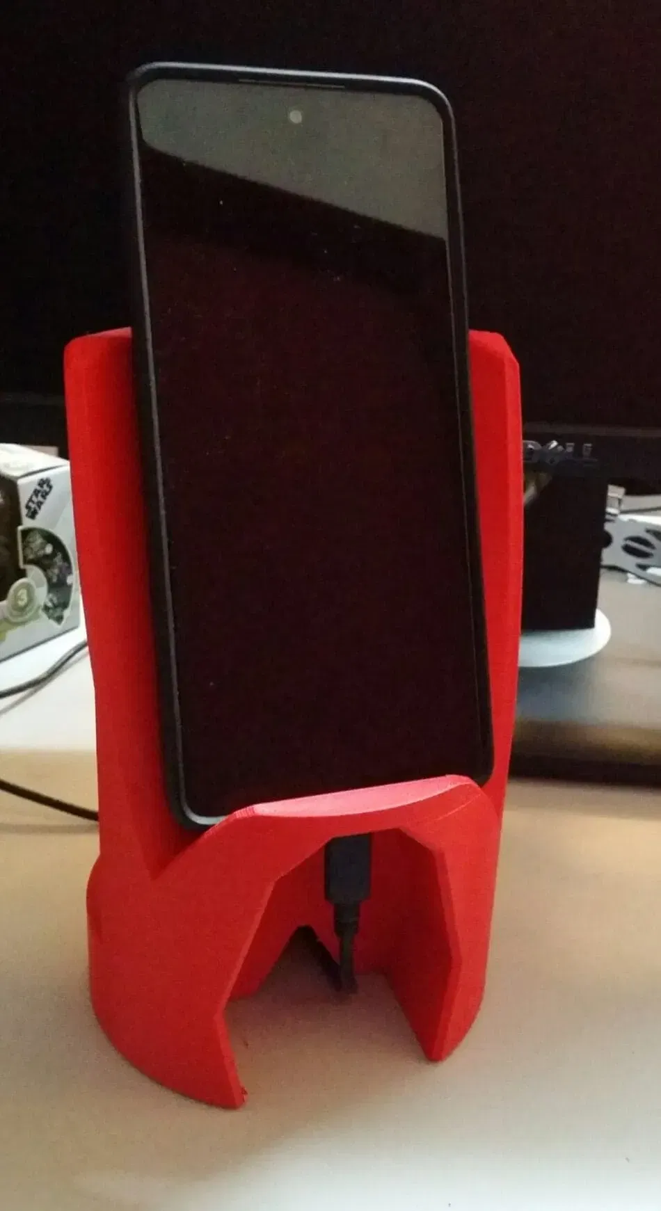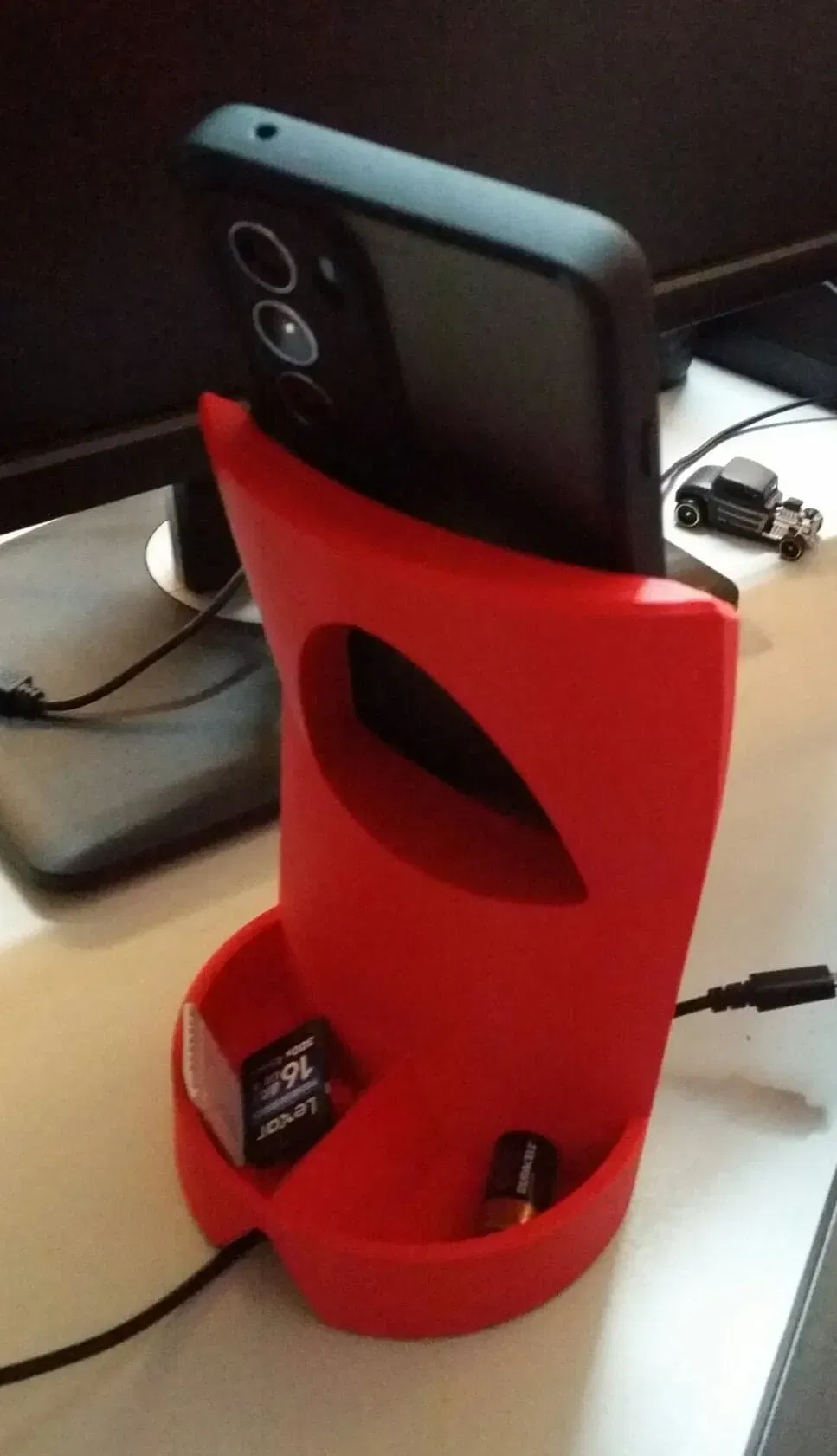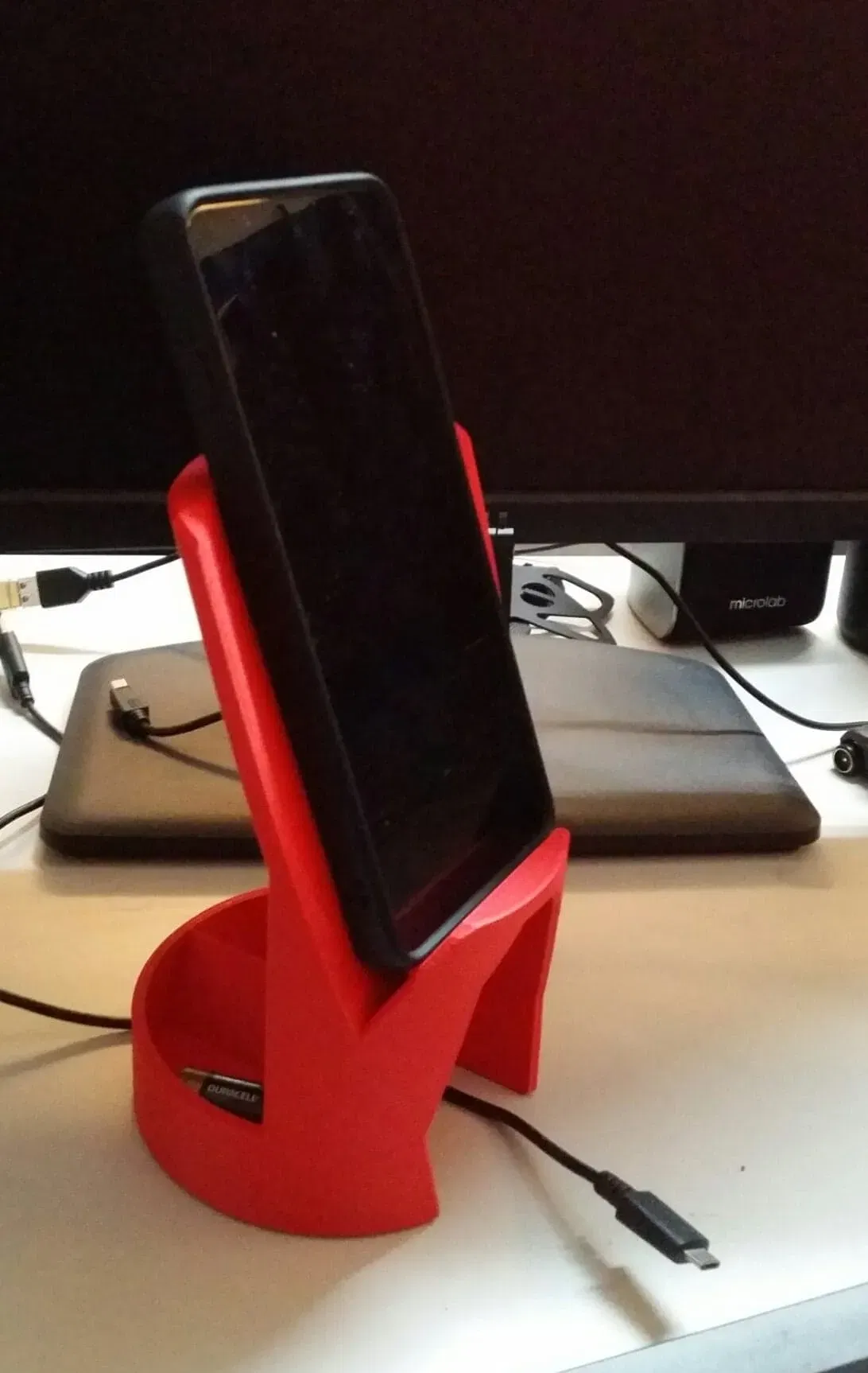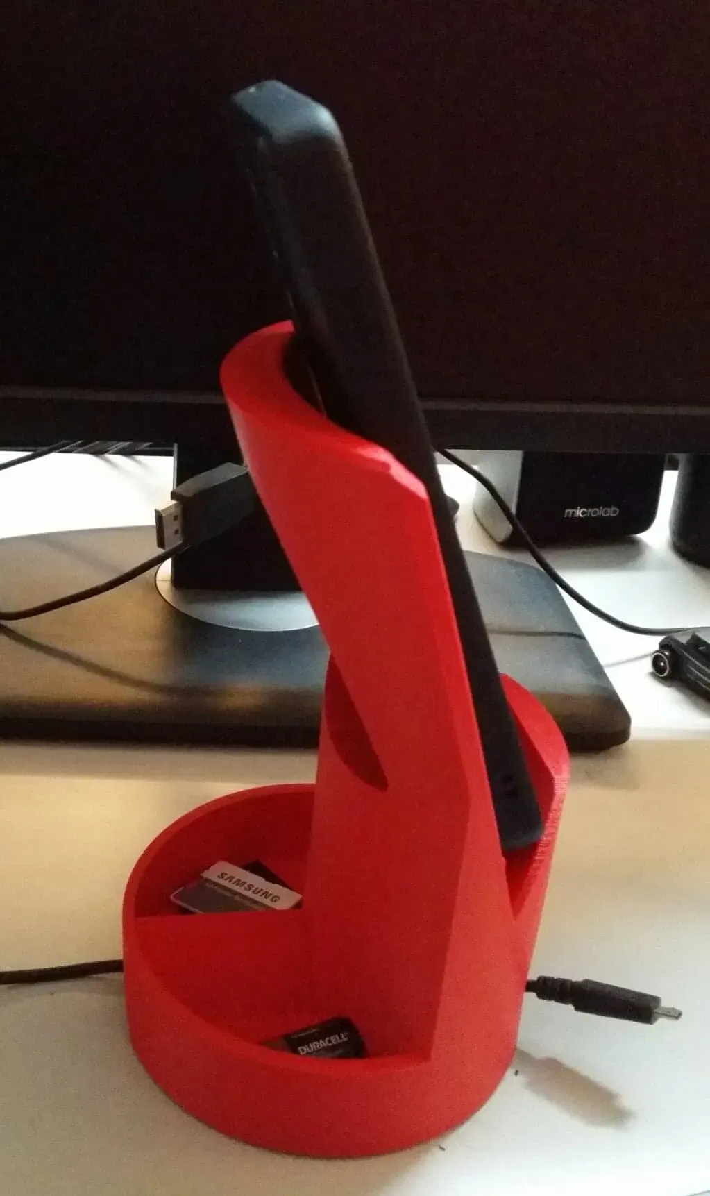 Tôi nhận thấy rằng tôi không có một chỗ để đặt điện thoại trên bàn gần khu vực nhìn, vì vậy tôi hình dung một giá đỡ điện thoại đứng và ổn định mà không cần phải chú ý khi tôi "ném" điện thoại lên đó. Vì vậy, đây sẽ là một giá đỡ điện thoại chắc chắn và rộng rãi, đạt được sự ổn định, chức năng và độ bền cần thiết cho việc sử dụng dễ dàng.