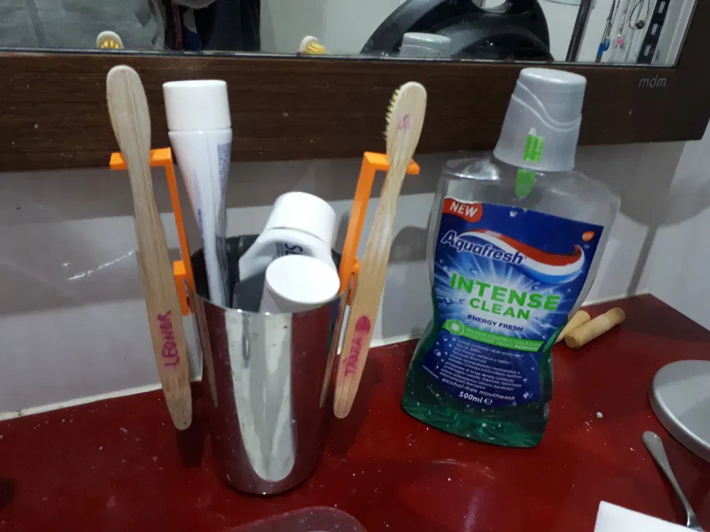 Bàn chải đánh răng tre trở nên thực sự xấu xí khi chúng chạm vào đáy cốc, vì vậy tôi phải tìm cách giữ chúng lên