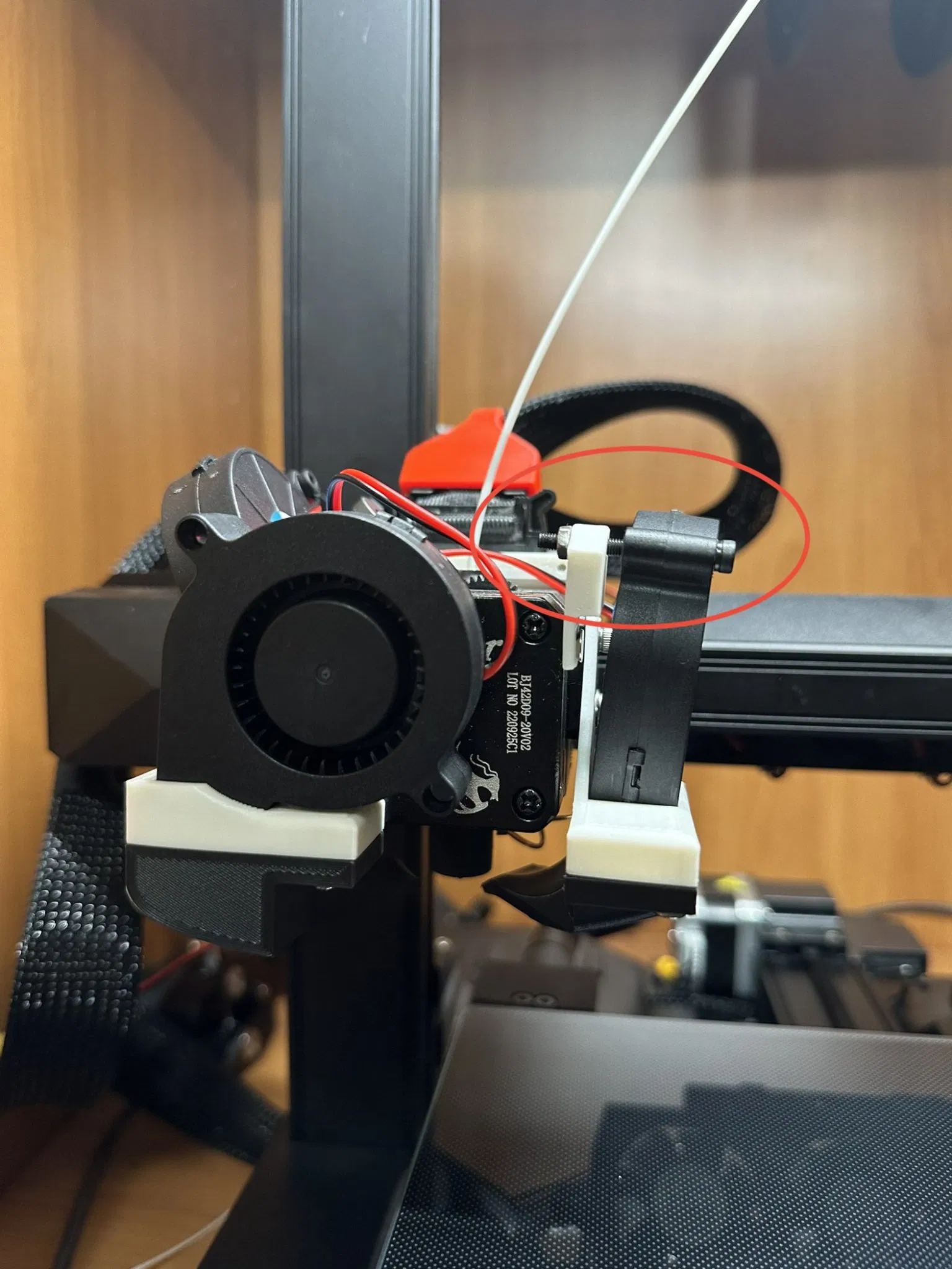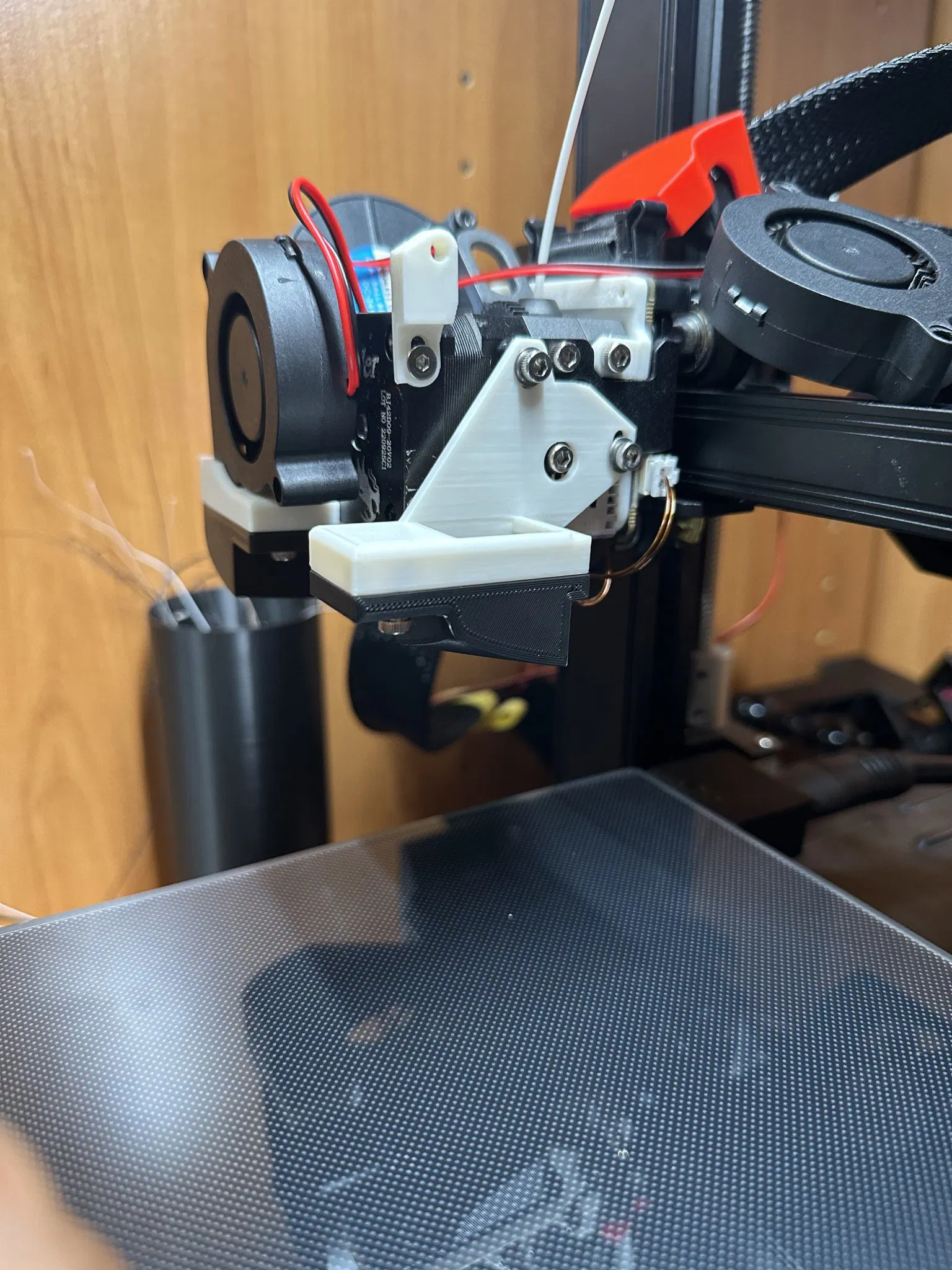 -Cài đặt quạt (đối với quạt bên phải, bạn sẽ cần một vít M3x30 để gắn phần trên của quạt vào đầu đùn. Quạt này ngồi ở một góc nhẹ và vít này sẽ kéo nó vào một chút cũng như giữ quạt ở vị trí để tối đa hóa độ cứng)