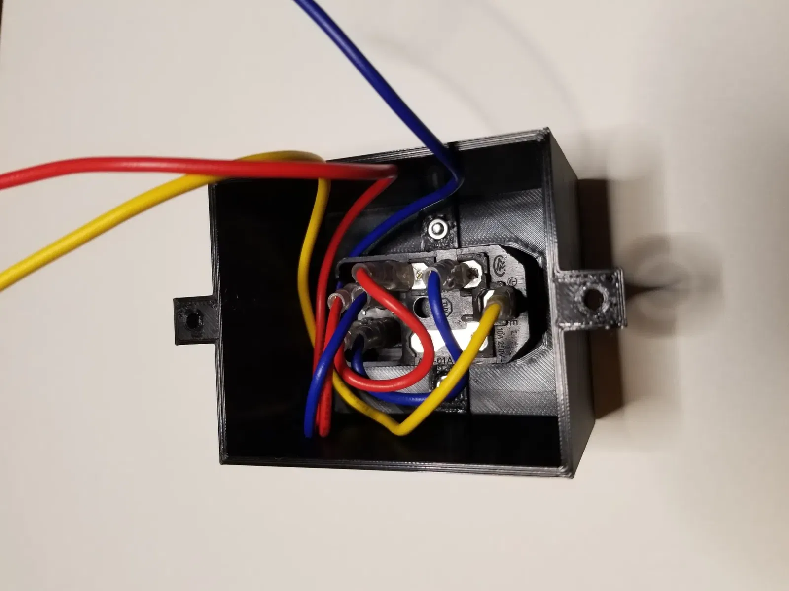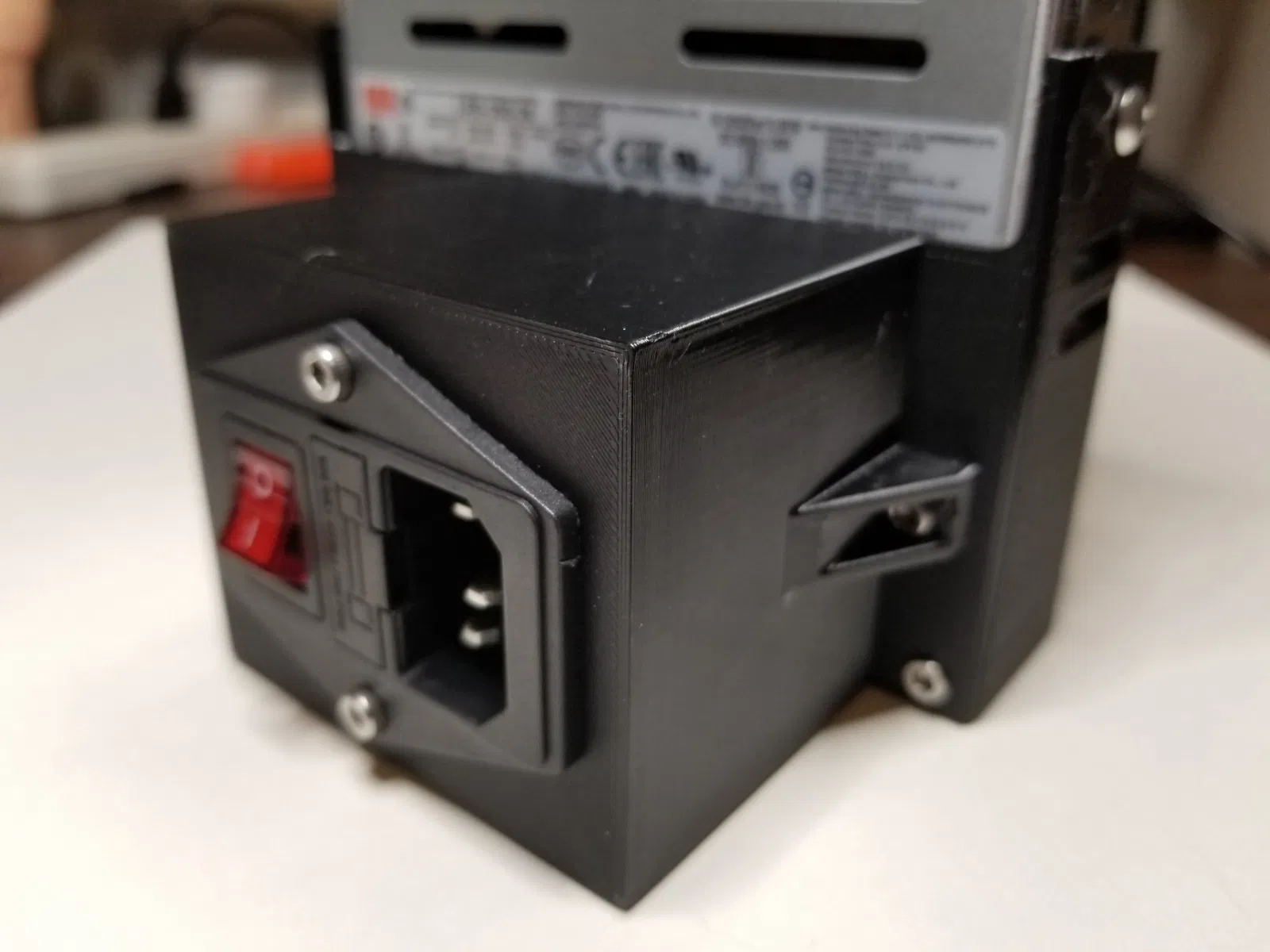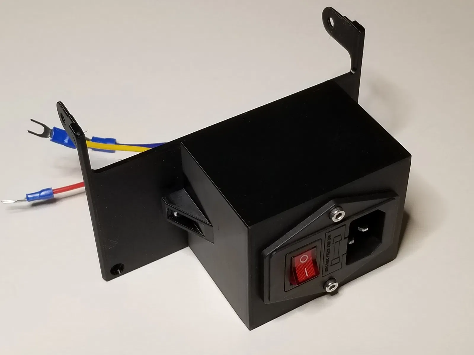 Tôi đã sử dụng ổ cắm này cho vỏ: Amazon.com: BIQU 15A 250V Rocker Switch Power Socket Inlet Module Plug 5A Fuse Switch with 5Pcs 16-14 AWG Wiring 3 Pin IEC320 C14 : Industrial & Scientific. Nó đã được kết nối sẵn và tôi cần thêm không gian để chạy dây.