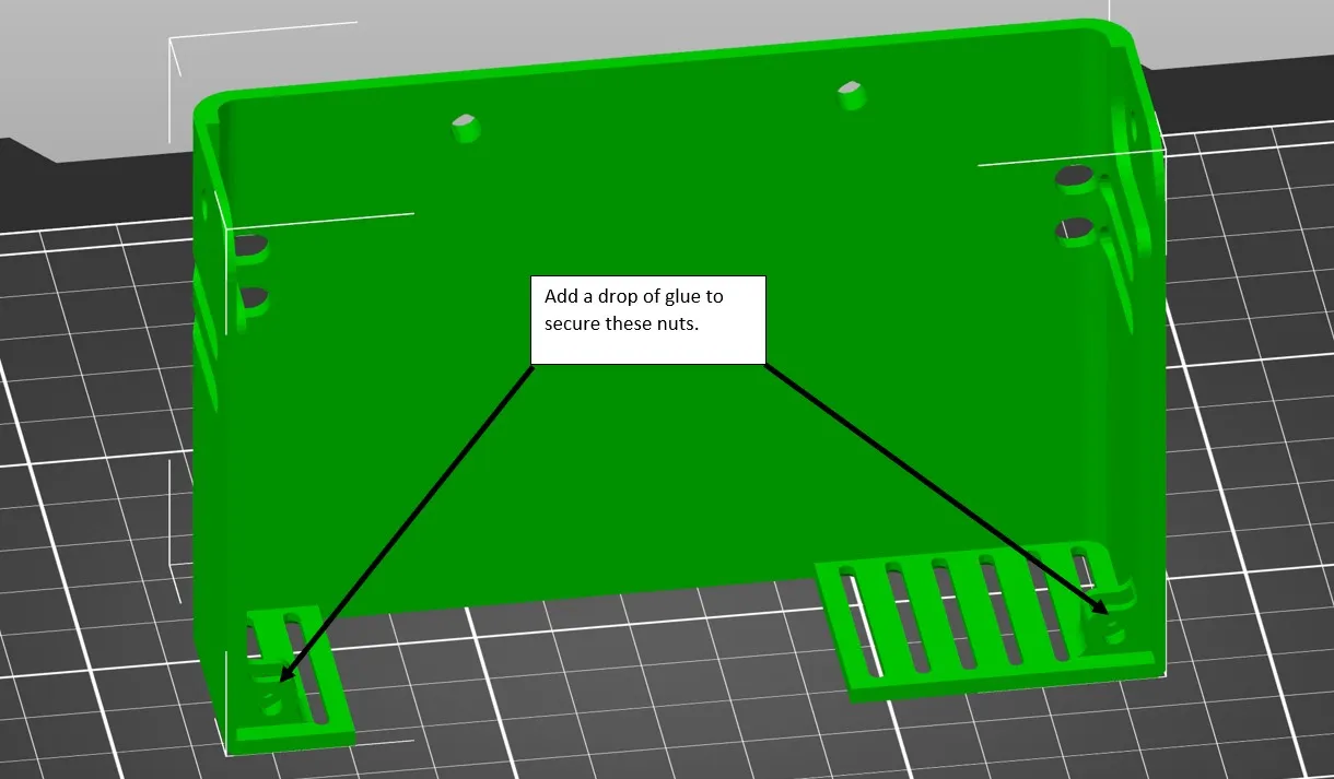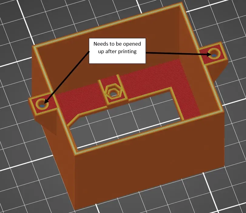 Có một bề mặt hy sinh trên các điểm gắn của hộp ổ cắm để hỗ trợ việc cầu nối tại lỗ. Những điểm này sẽ cần được cắt/khoan ra sau khi in.
