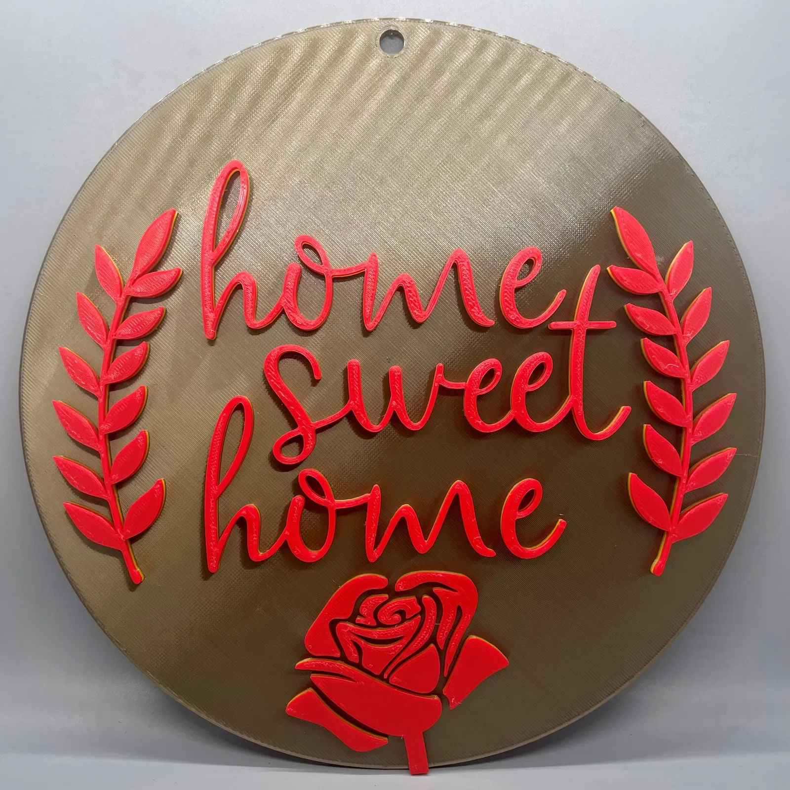 Đế được đùn, văn bản và hoa hồng nằm ở 3 độ cao khác nhau, vì vậy điều này có thể được in một màu, hoặc có thể thay đổi màu cho mỗi mục để làm cho nó trở nên độc đáo.