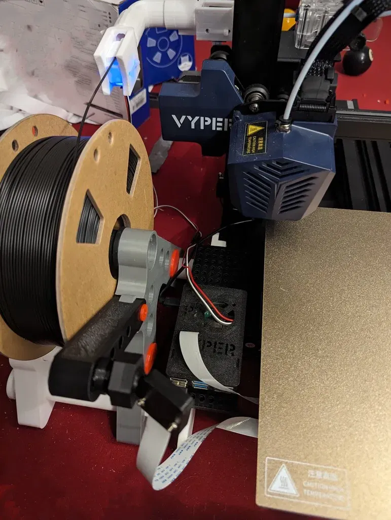 Đây là thiết lập của tôi để giảm chiều rộng của máy in để vừa vào hộp mà tôi đang xây dựng. Tôi đã xoay cuộn filament 90 độ để nó ít rộng hơn. Nó thêm một cảm biến hết filament nữa cho raspberry pi của tôi, sử dụng bạc đạn và con lăn cùng với ống giữ filament hiện có đi kèm với vyper. Tất cả được gắn bằng một đế kẹp với nắp có lỗ giống như lego để gắn hộp pi của tôi. Cũng có một cánh tay cho camera pi.