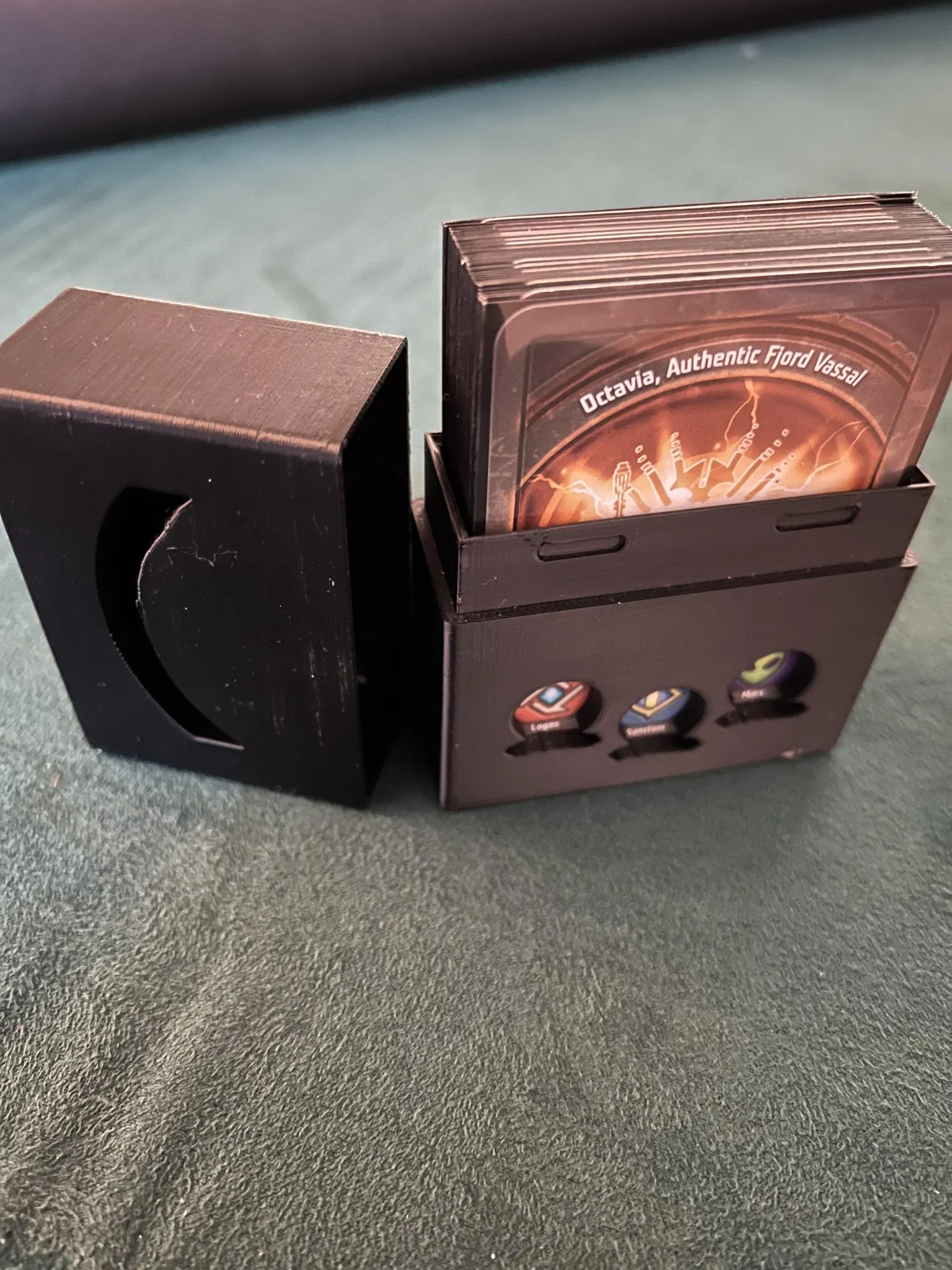 Hộp bài Keyforge với nắp bán khóa. Tôi muốn một hộp có nắp với phần trên + dưới thay vì nắp trượt. Điều này cũng sẽ vừa với những lá bài đã được bọc.