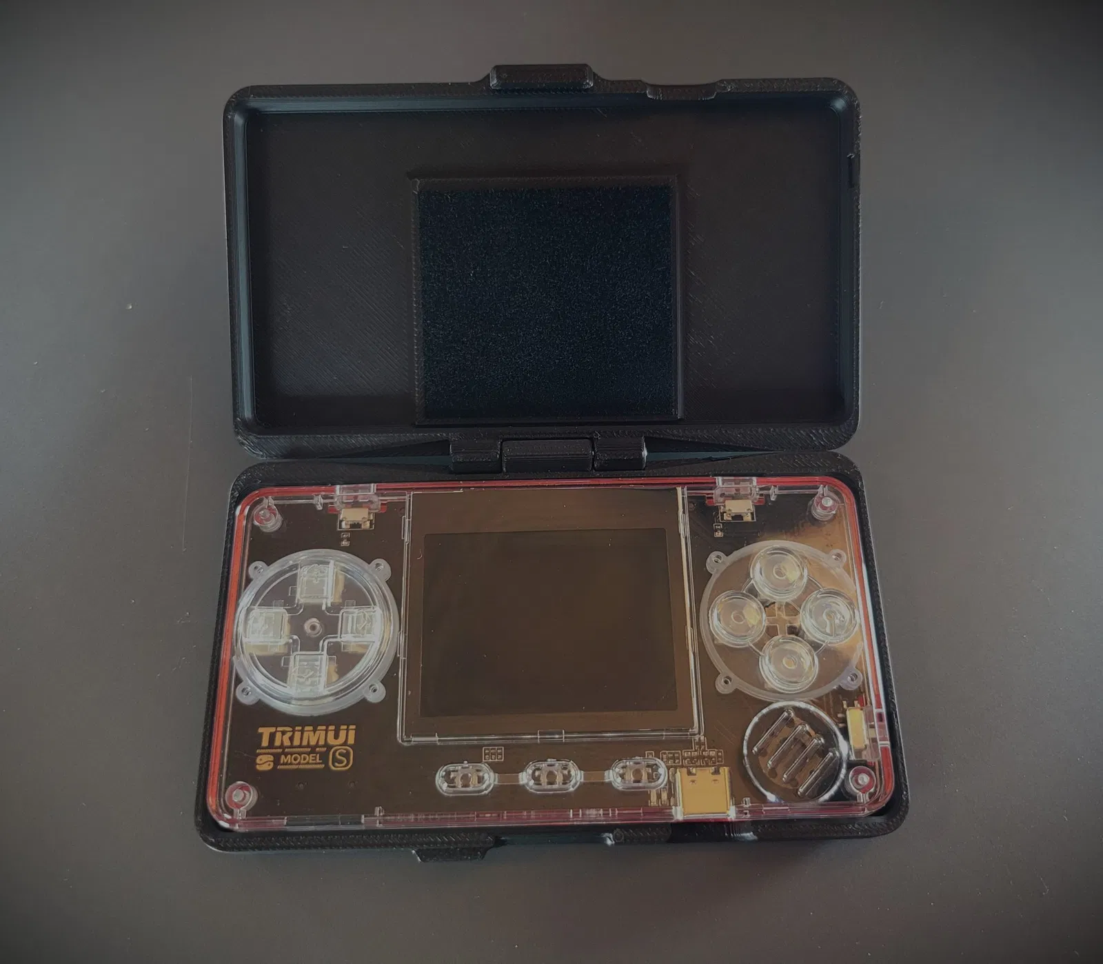 Một vỏ bảo vệ đơn giản cho TrimUI Model S (còn được biết đến với tên gọi Powkiddy A66). Nó có một khóa an toàn với một "tab ngón tay" đối diện để giúp mở ra, và một lỗ cắt cho phép sạc để bạn có thể sạc thiết bị cầm tay trong khi nó đang trong vỏ. Đèn LED sạc cũng hiển thị trong khi sạc.