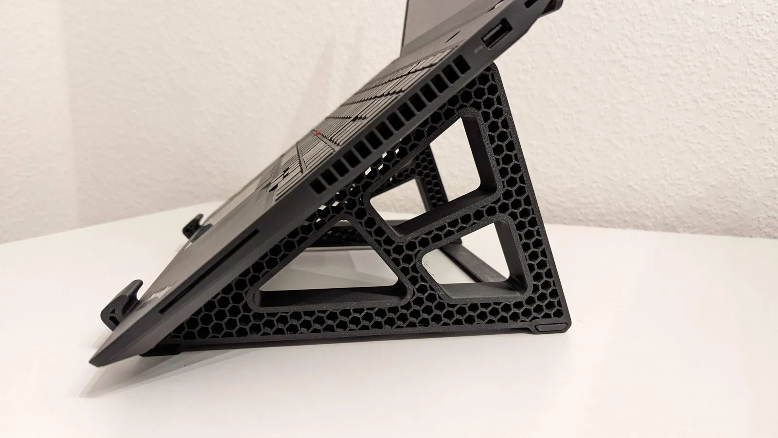 Một giá đỡ máy tính xách tay tăng cường thiết bị đủ cao để có thể sử dụng được như màn hình bổ sung.
