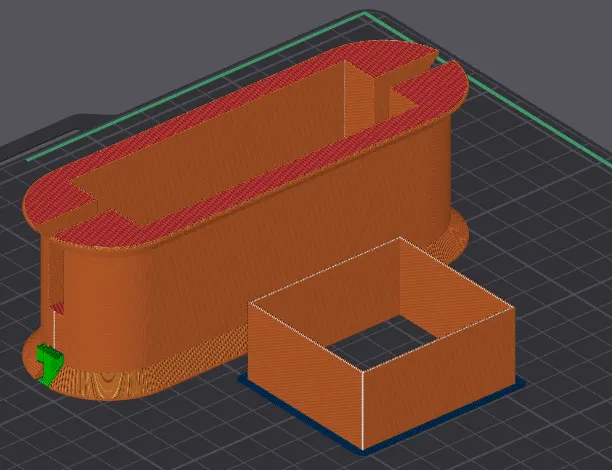 In được in với khe nông hướng xuống và chỉ có các hỗ trợ chặt chẽ trên bề mặt in. Tôi đã sử dụng một viền 3mm xung quanh băng để giúp tăng độ bám dính nhưng tôi không chắc nó có cần thiết hay không.