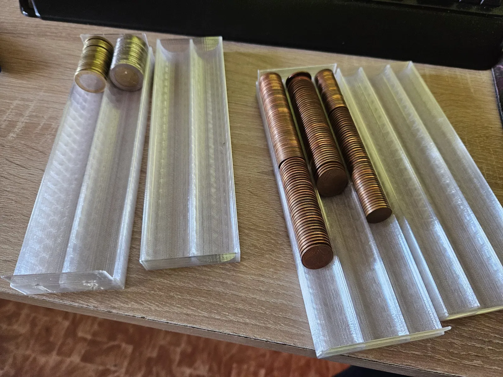 Tôi làm việc ở nước ngoài và mỗi khi về nhà, tôi thường rỗng ví, và những đồng xu nhỏ bắt đầu chất đống ở đây, vì vậy tôi đã nghĩ ra một điều ngớ ngẩn, nhưng có thể sẽ có người cũng thấy hữu ích. Đó là những hộp có thể đóng lại dài 20 cm để đựng đồng xu đồng (1, 2 và 5 cent), đồng xu vàng (10, 20 và 50 cent) và đồng euro (1 và 2 €).