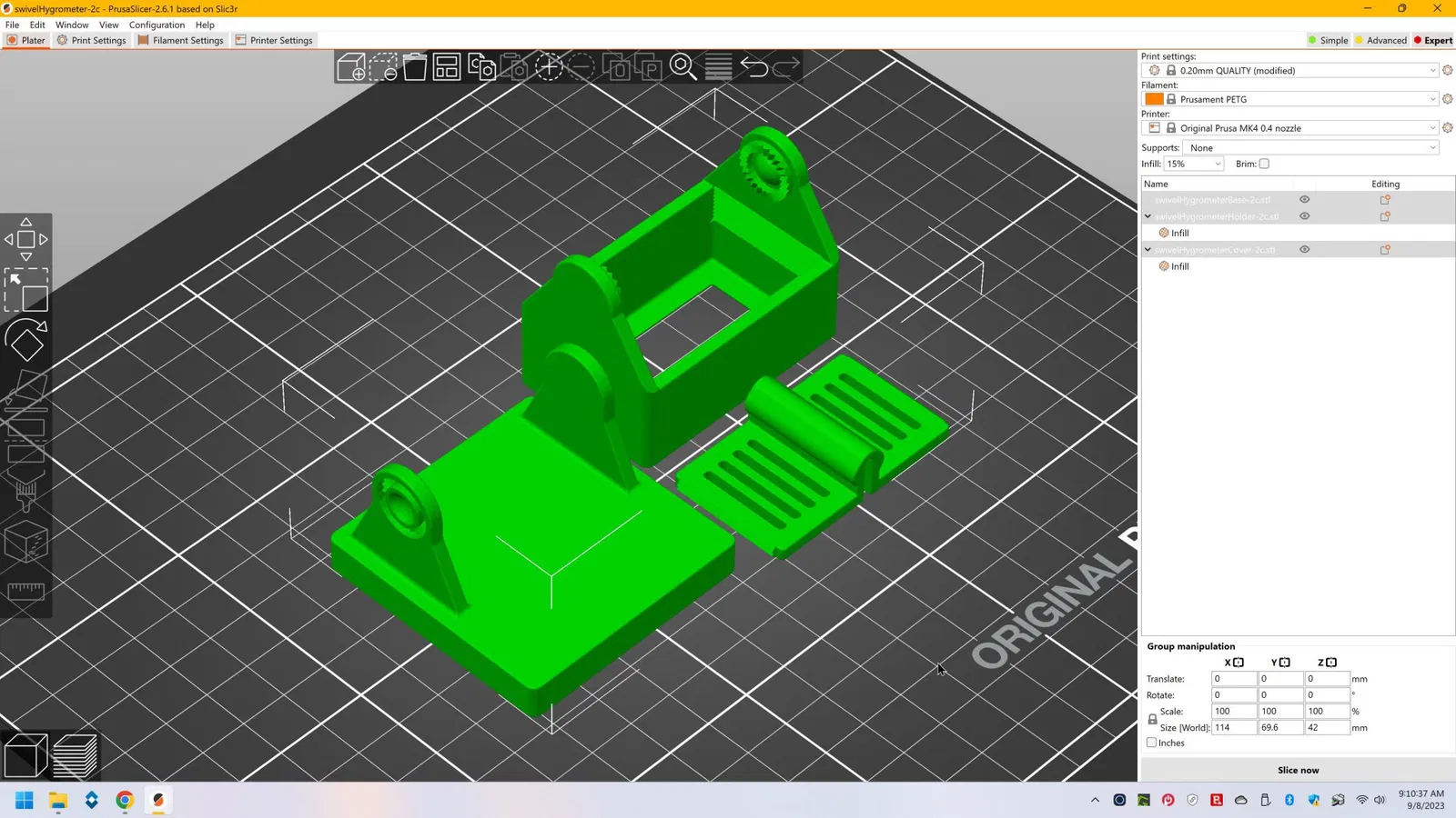 Tôi đã tạo ra Giá đỡ Hygrometer Xoay để cung cấp một vỏ bọc hấp dẫn và chức năng cho loại hygrometer đi kèm với Vỏ Prusa Gốc (và cũng có sẵn từ hàng chục nhà cung cấp trên Amazon, AliExpress, v.v.). Giá đỡ có thể được đặt trên bất kỳ bề mặt phẳng nào và có thể xoay để có góc nhìn tốt nhất. Không giống như hầu hết/tất cả các thiết kế khác trên F3D, thiết kế của tôi hoàn toàn bao bọc mọi thứ ngoại trừ màn hình - cho phép bạn sử dụng bất kỳ màu sắc nào bạn thích thay vì viền đen/trắng rộng 10mm được sử dụng trong hầu hết các hygrometer kỹ thuật số mini này. Giá đỡ này được thiết kế cho các hygrometer có kích thước bên ngoài (tối đa) là 48mm chiều rộng, 28mm chiều cao và 11-18mm chiều sâu. Mở cho màn hình có kích thước 38mm chiều rộng và 19mm chiều cao - nhằm che giấu gần như toàn bộ viền của hygrometer. Và tất nhiên có các lỗ thông hơi để cho phép cảm biến hoạt động đúng cách! CẬP NHẬT Ngày 12 tháng 3 năm 2025: Thiết kế này cung cấp 13 vị trí cho màn hình. Với một số loại filament, vị trí đã chọn có thể không giữ chặt, vì vậy tôi đã công bố một thiết kế mới “Giá đỡ Hygrometer Bảy Vị Trí” chỉ cung cấp 7 vị trí, nhưng cung cấp khả năng giữ vị trí màn hình đã chọn tốt hơn nhiều. Kiểm tra phiên bản đó tại: <> Các tệp STL được cung cấp được dự định để in bằng PETG và không yêu cầu hỗ trợ. Các tệp 3MF của eSlicer được cung cấp cho Prusament PETG và các tệp G-code được cung cấp cho Original Prusa MK4 - với cả ba thành phần (giá đỡ, đế và nắp) cùng nhau cũng như mỗi thành phần trong một tệp riêng biệt (trong trường hợp bạn muốn phối màu). Giá đỡ ẩm kế xoay được thấy trong hầu hết các bức ảnh được in trên máy Original Prusa MK4 bằng Prusament Orange PETG với đầu phun 0.4mm ở độ cao lớp 0.2mm với 15% độ đổ đầy gyroid cho phần đế (15% để cung cấp một chút trọng lượng bổ sung) và 5% độ đổ đầy gyroid cho giá đỡ và nắp. Bức ảnh nắp được in với cùng cài đặt sử dụng sợi PETG trắng Sunlu. Hãy chắc chắn kiểm tra các thiết kế khác của tôi - bao gồm các nắp chìa khóa đa năng và một bộ sưu tập đa dạng các phụ kiện gia đình và công cụ in 3D - trên F3D tại <https://www.f3d.vn/profile/philcaruso