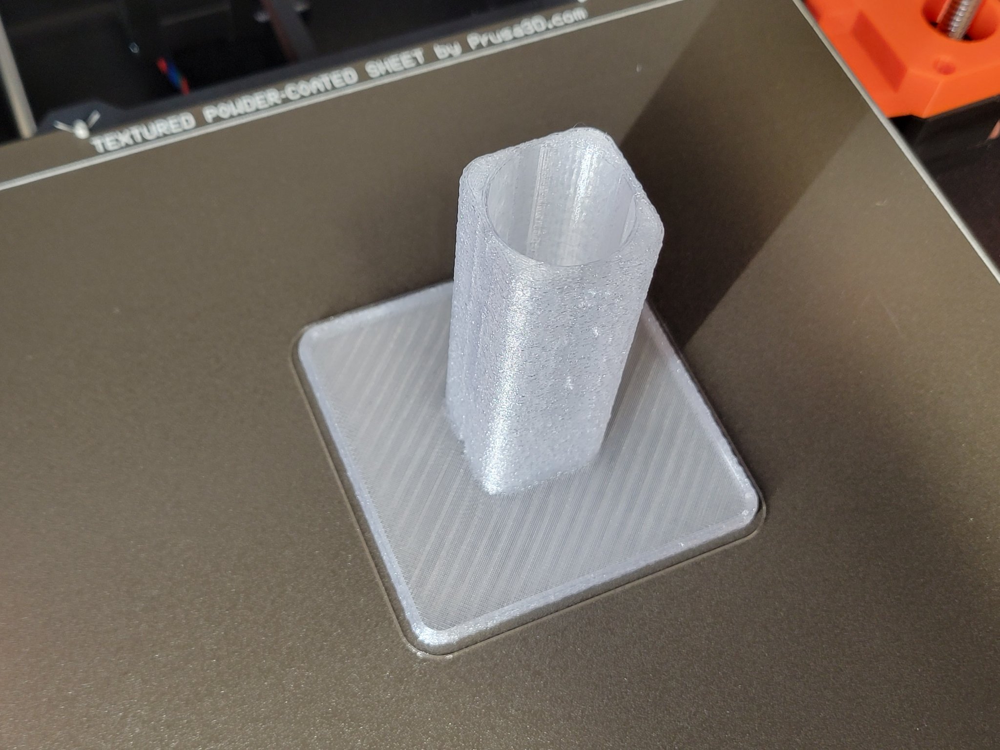 Các bức ảnh đính kèm cho thấy phiên bản fuzzy được in bằng PETG trong suốt chung với chiều cao lớp 0.3mm và độ đầy gyroid 15% được in trên một chiếc Prusa MK4.