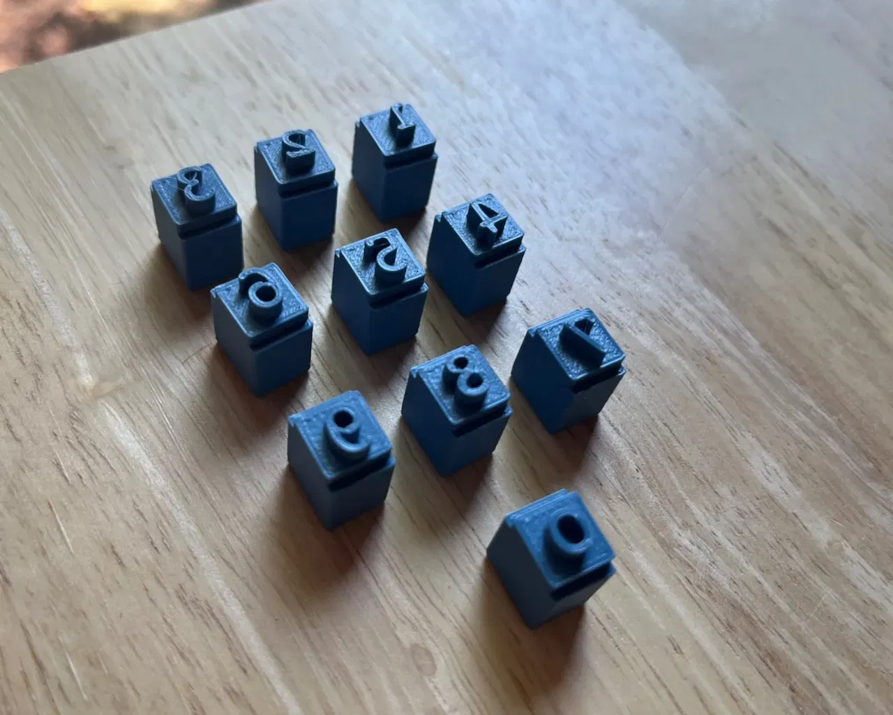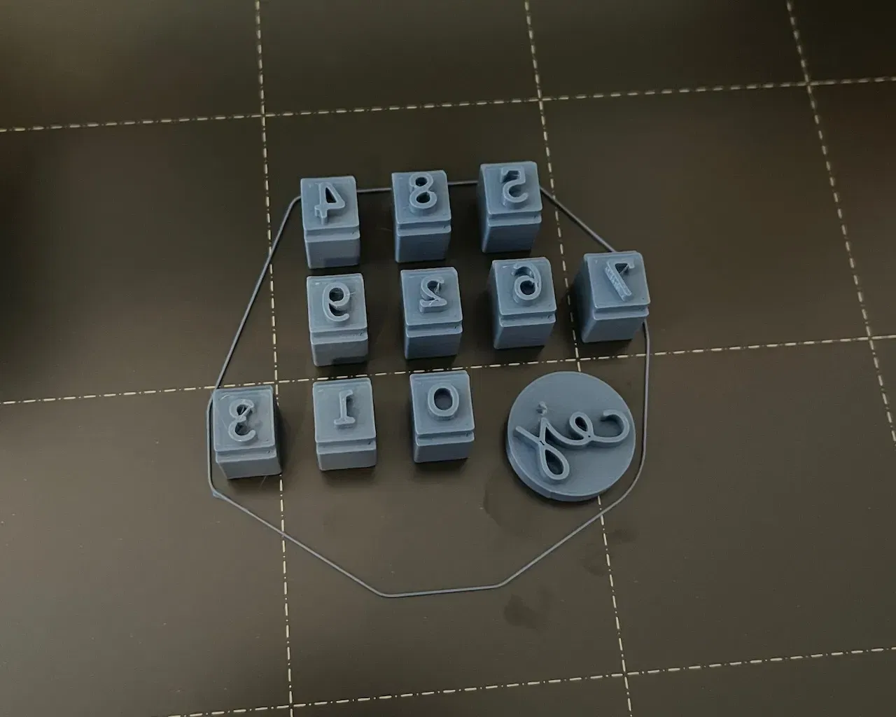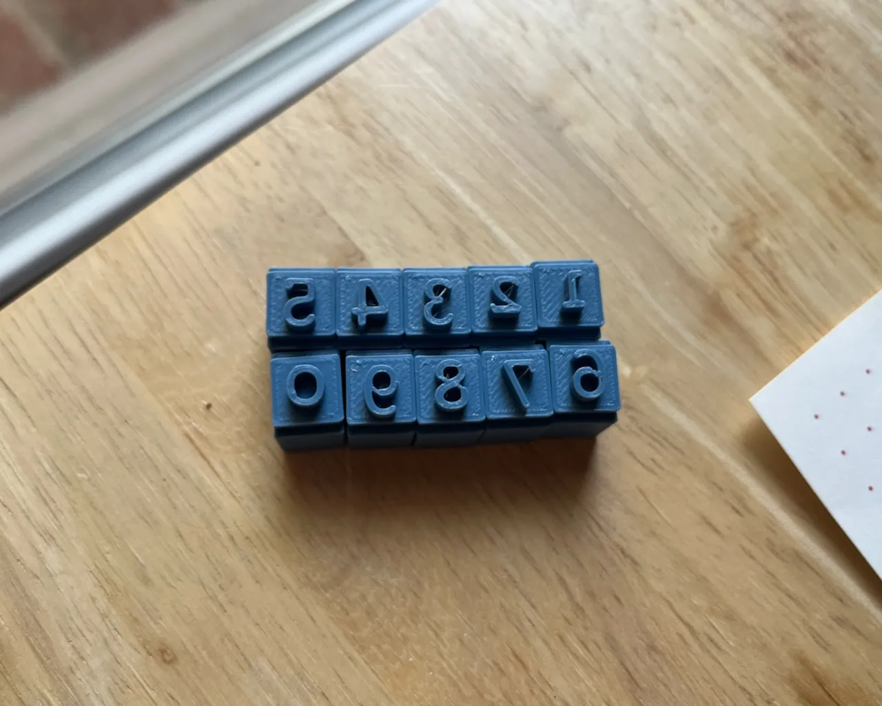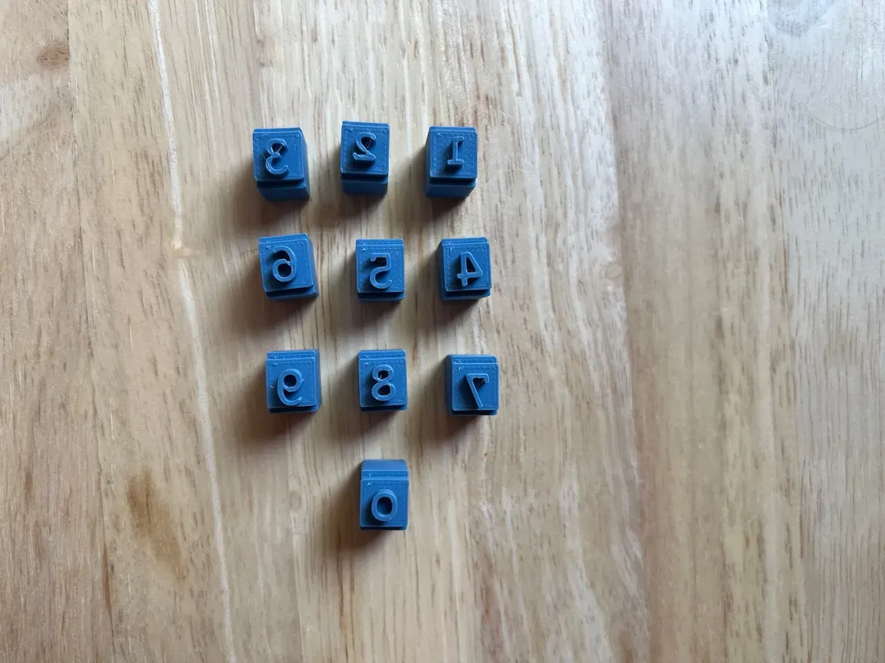 Tem số để đóng lên đất sét, kem hoặc bất kỳ bề mặt mềm nào khác. Những chữ cái này cao ¼" và có phông chữ Zilla Slab. Mỗi chữ số cao ¼" (hoặc 6.4mm), và mỗi con dấu chứa một ấn tượng của chữ số tương ứng. Những mẫu này được thiết kế để đi kèm với các con dấu chữ cái gốc của tôi. Tôi đã in những cái này với độ cao lớp là .2mm trên cài đặt in chất lượng của Prusaslicer. In với độ cao lớp tăng lên không nên ảnh hưởng đến bề mặt đã đóng dấu. Các tệp này có sẵn để sử dụng trên các mặt hàng bạn đang bán, nhưng xin vui lòng không bán bản sao của mẫu này.