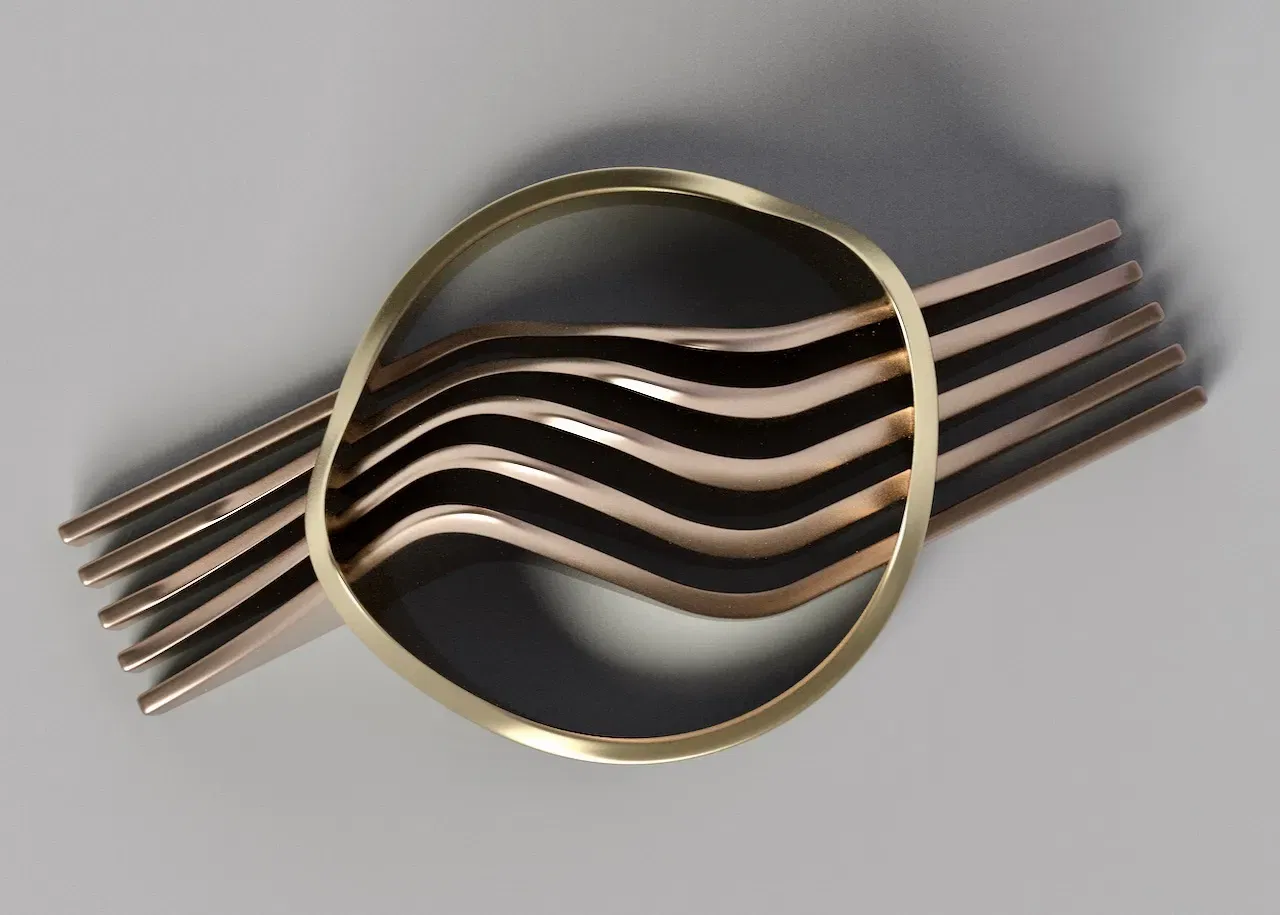 Đây là một tác phẩm điêu khắc trừu tượng sử dụng các hình dạng đơn giản nhưng tạo ra một thiết kế thanh lịch. Nó có thể là một thiết kế nghệ thuật, một chiếc cúp, một giải thưởng, hoặc một thiết kế nghệ thuật treo tường.