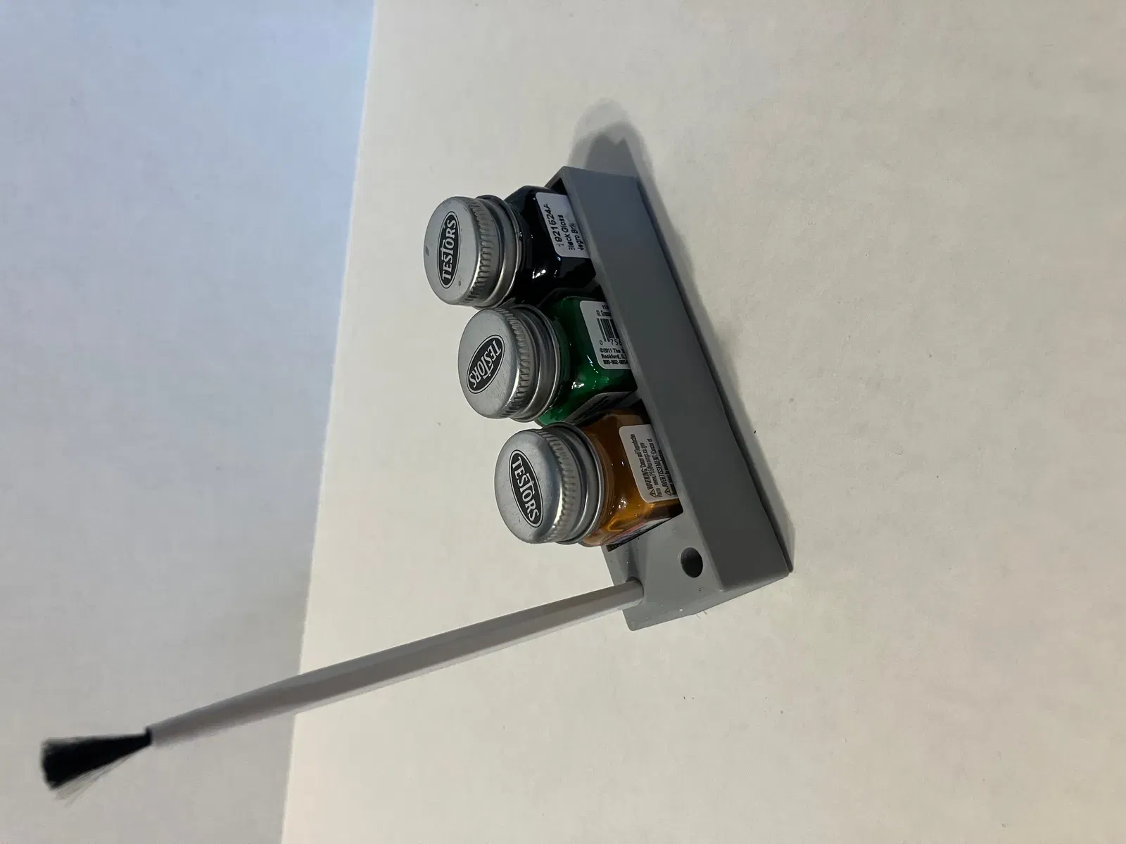 Mô hình này dùng để giữ ba lọ sơn nhỏ của Testor và hai cọ vẽ nhỏ. Giá đỡ này có thể hữu ích cho các mô hình, xe RC, hoặc chỉ đơn giản là vẽ tranh.
