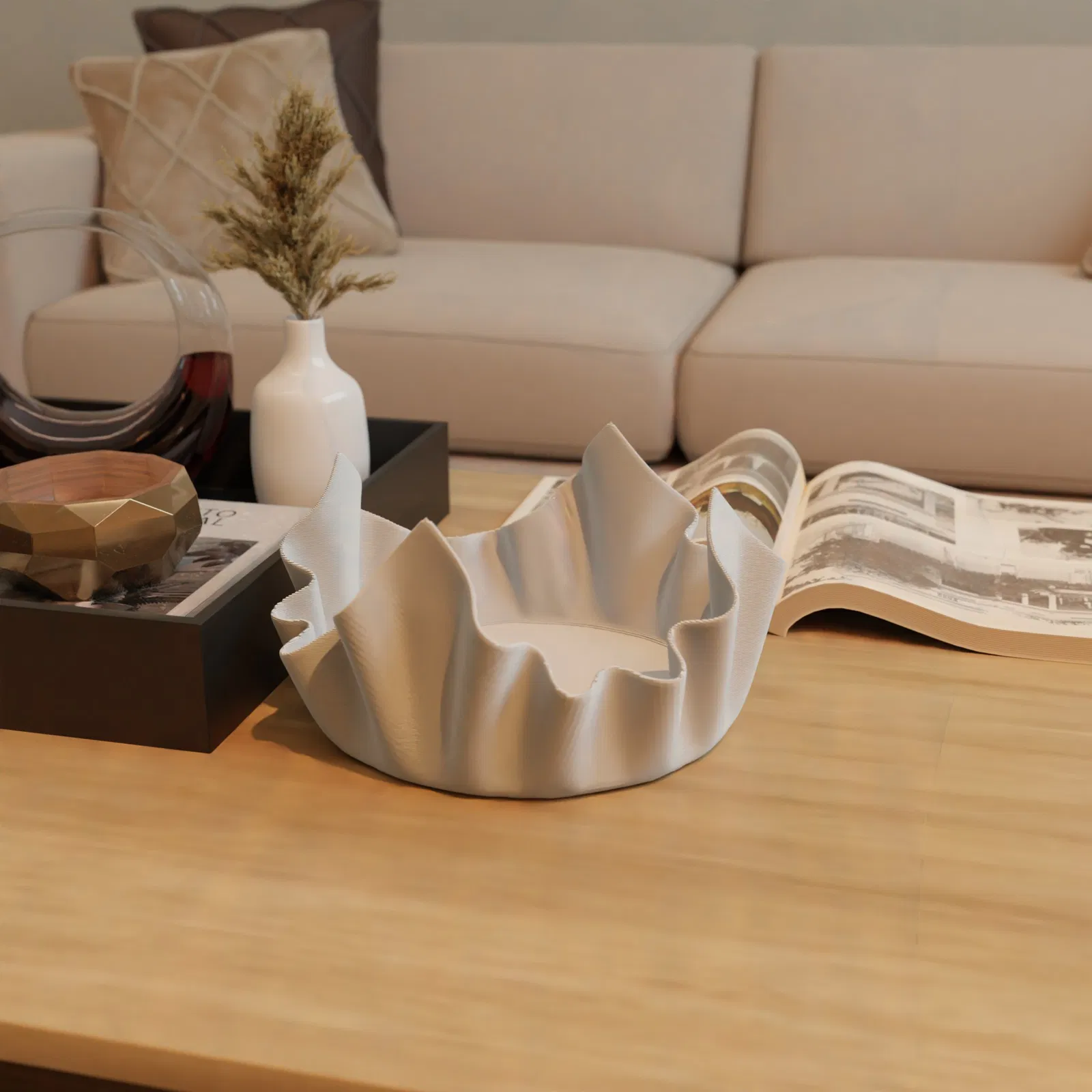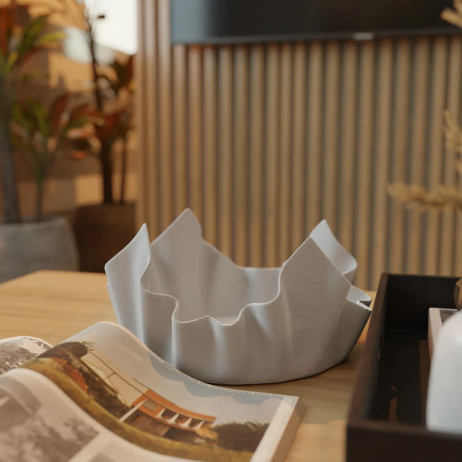 Bát vui được làm bằng Blender và vật lý vải. Giống như một mảnh vải được dừng lại trong thời gian. Có thể được thay đổi kích thước để sử dụng ở nhiều kích thước khác nhau. Trông rất đẹp khi làm từ PLA trắng.