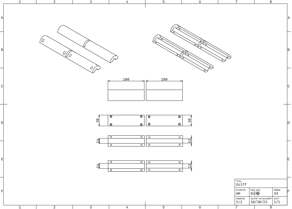 Đây là một tay cầm cho một tay quay của một chiếc caravan, như được hiển thị trong bức tranh cuối cùng ở trên. Tay cầm bằng nhựa được lắp ráp sẵn quay cùng với tay quay, điều này làm cho tay quay khó hoạt động. Tay cầm mà tôi thiết kế ngồi lỏng hơn trên trục và trục có thể quay mà không làm tay cầm di chuyển. Tay cầm của tôi dài 10 cm và có đường kính lỗ 12mm hoặc 14mm tùy thuộc vào phiên bản. Tôi đã in tay cầm bằng ASA. Tay cầm được đặt xung quanh trục và được cố định bằng bốn đinh vít M3*6. Trước đó, bốn chèn ren M3 phải được nung chảy vào một phần.