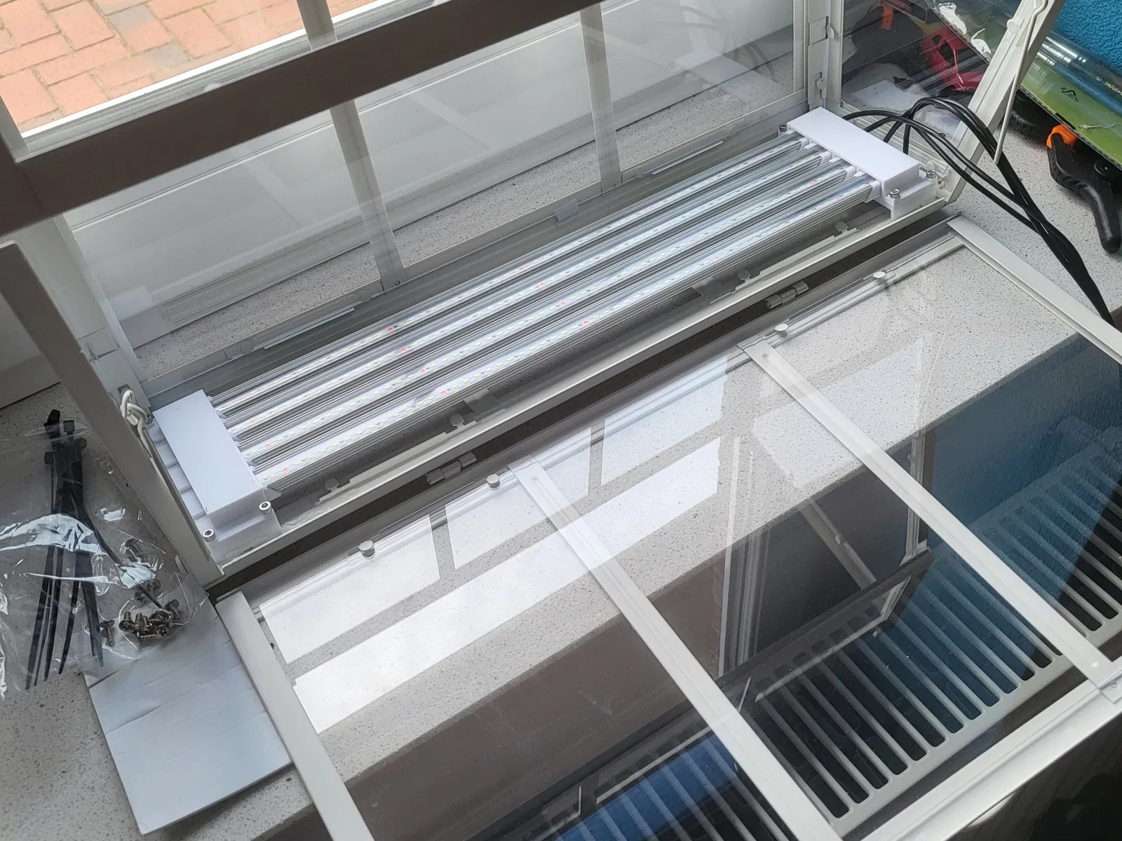 Bạn cần 8 vít M3x6 hoặc bạn có thể dán các mảnh lại với nhau. Tôi đã sử dụng keo siêu dính và băng dính hai mặt để cố định nó trong nhà kính. Nó hơi khó khăn để làm cho nó hoạt động nhưng có thể thực hiện được.