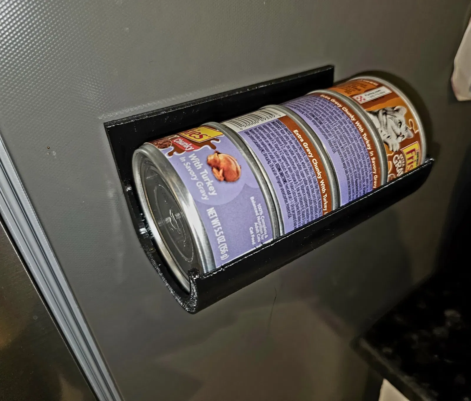 Tôi đã thiết kế cái này để đựng các hộp thức ăn cho mèo. Nó có thể được sử dụng cho các kích thước hộp khác nhau. Có thể phải điều chỉnh kích thước trong slicer nếu hộp của bạn quá lớn. Tôi đã sử dụng băng dính hai mặt để cố định nó vào tủ lạnh của mình, nhưng tôi đã khoan lỗ vào nó để có thể treo ở bất kỳ đâu. In nó nằm ngang với việc sử dụng hỗ trợ hữu cơ, mất hơn bốn giờ với PETG trên máy in mini của tôi.