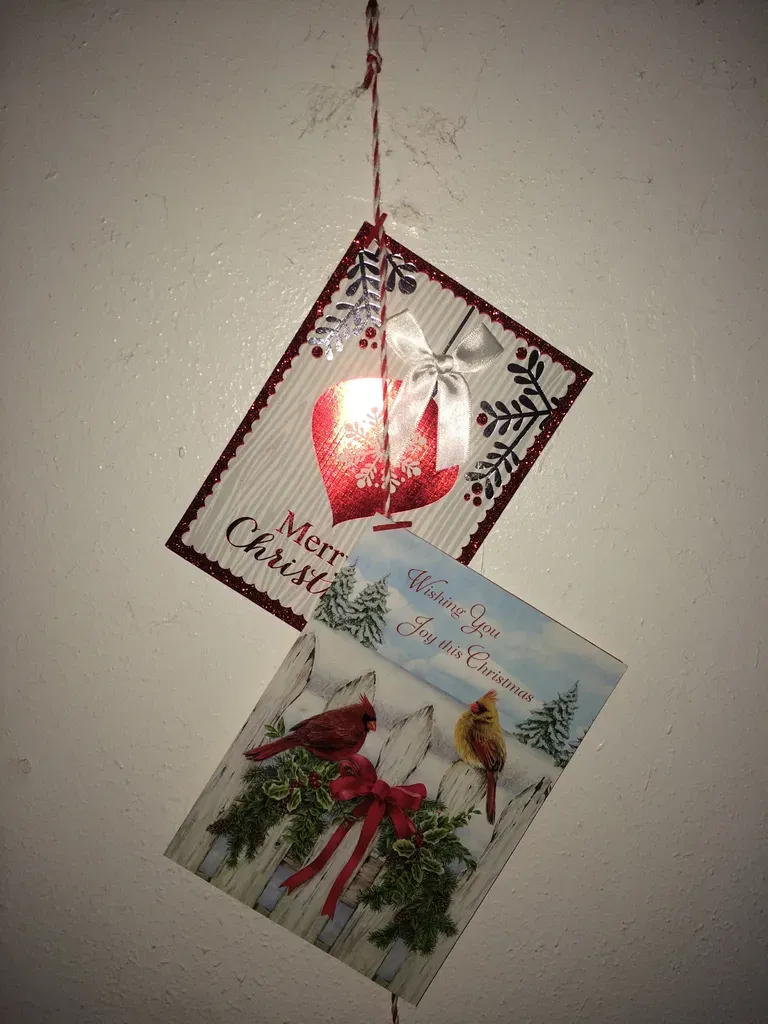 Chúng tôi đã có điều gì đó tương tự như thế này khi còn nhỏ. In một nửa tá màu sắc lễ hội và tìm một sợi dây. Bạn có thể sử dụng những chiếc ghim nhỏ này để treo thiệp Giáng sinh hoặc những thứ khác.