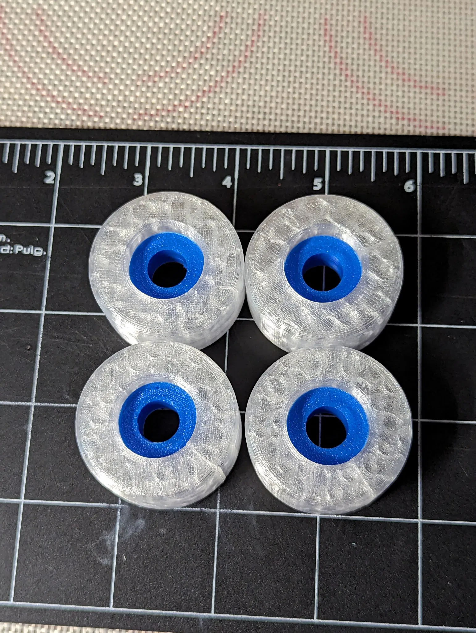 Một thiết kế đơn giản. Tôi thường in lốp xe bằng TPU. Bạn có thể in chúng mỏng và nhẹ hơn thì chúng sẽ mềm hơn. Bức ảnh là Creality Clear TPU với một chút PLA màu xanh cho bánh xe. Bánh xe và lốp xe có một 'bead' tương ứng để giữ lốp ở vị trí.