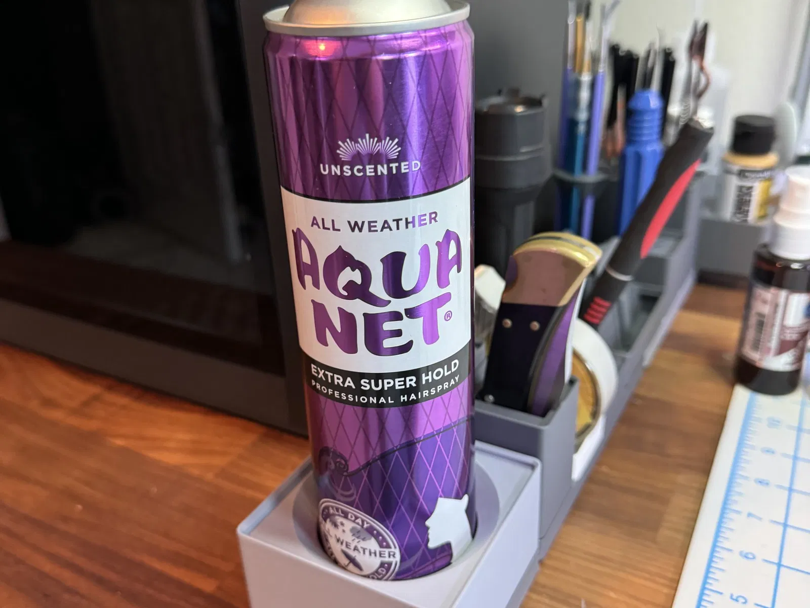 Chán ngấy việc liên tục tìm kiếm chai Aqua Net của mình mỗi khi cần, tôi đã quyết định tạo một chỗ dành riêng cho nó trên bảng nền Gridfinity bên cạnh máy in của tôi.