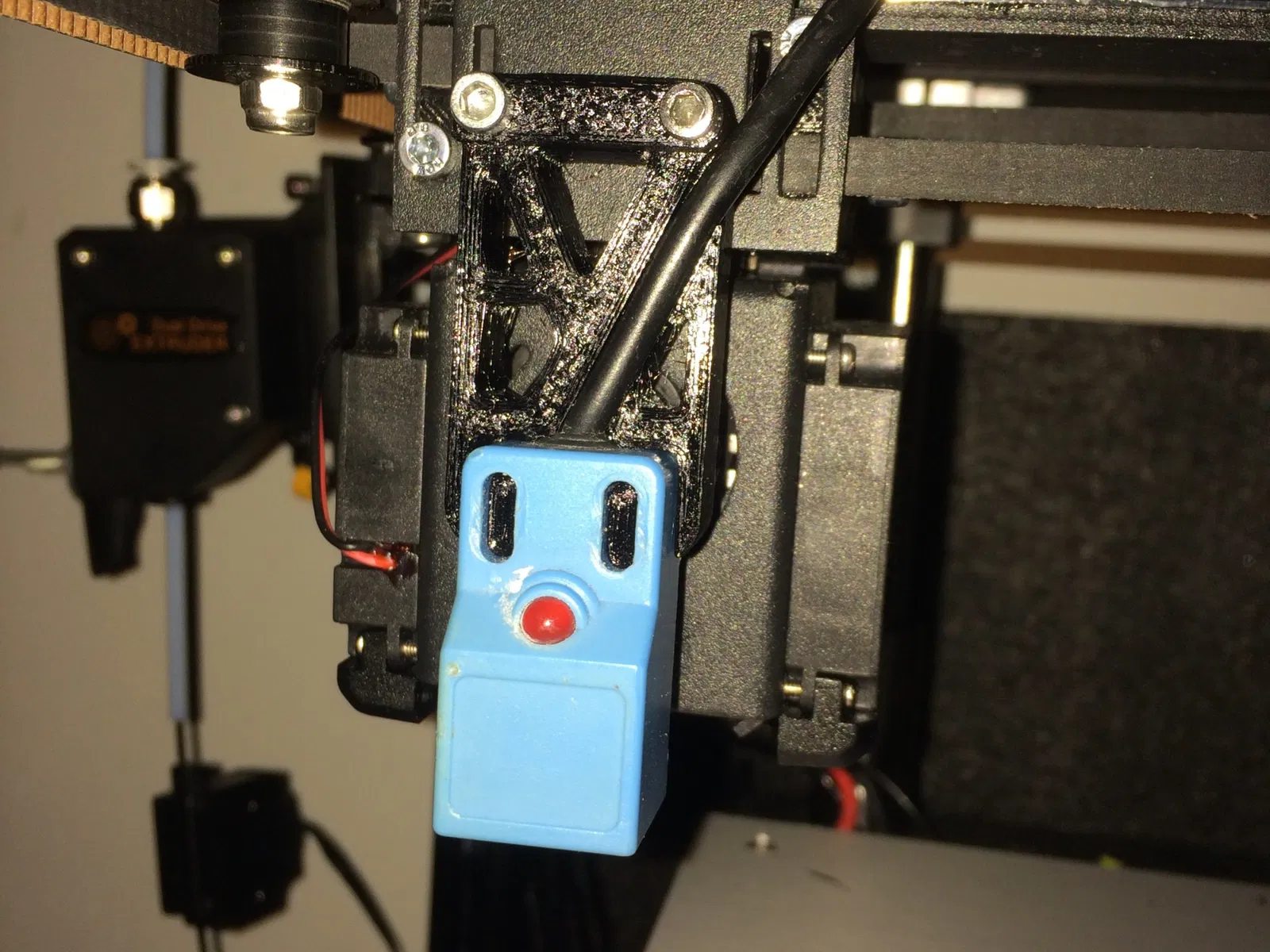 Gắn cho một cảm biến gần. Chỉ cần 2 vít. Cảm biến gần được ép chặt vào phần in. Độ lệch đến vòi phun là -48mm trên trục Y.