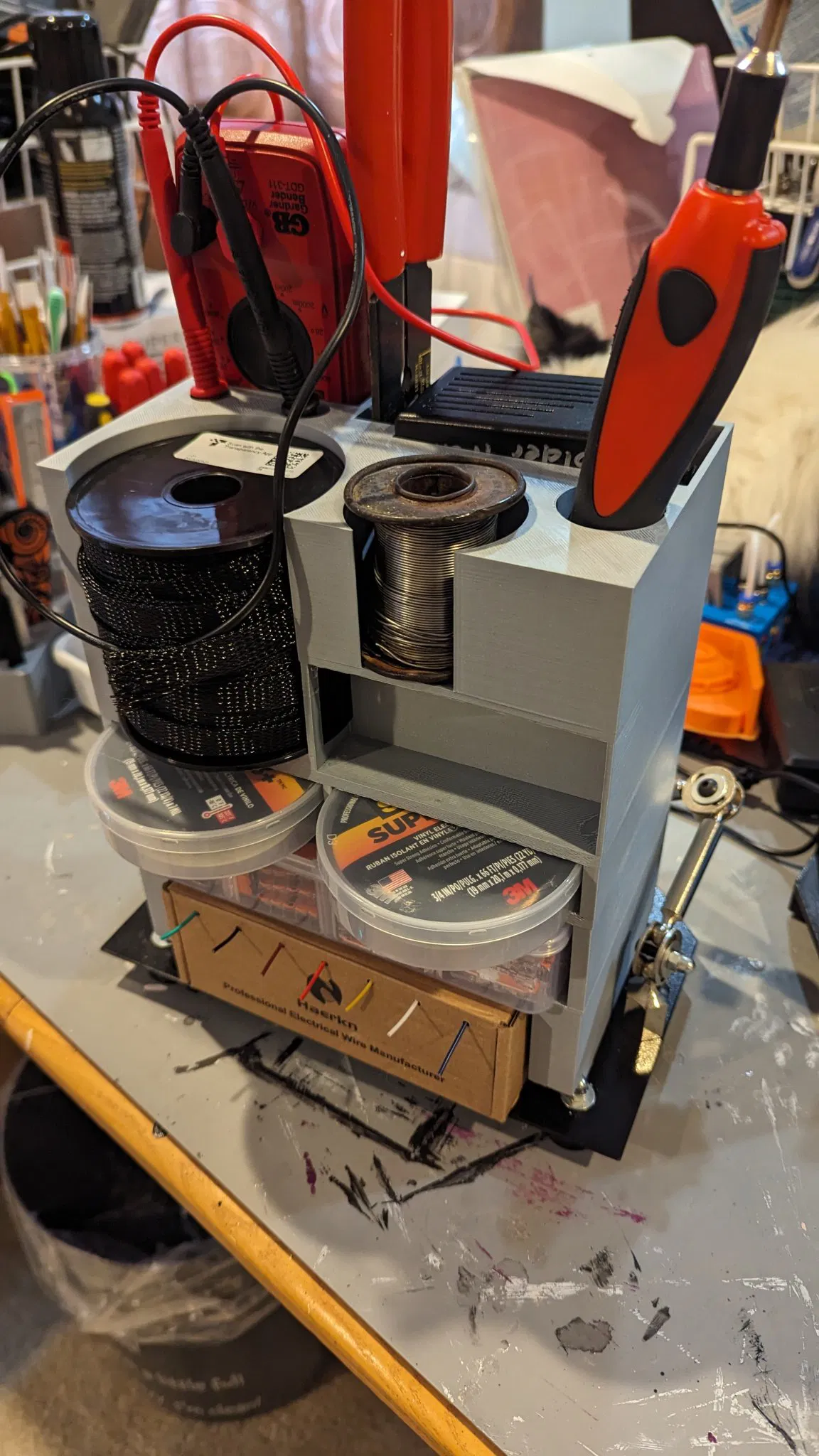 Phiên bản của tôi về một trạm hàn và điện. Nó nằm trên một cặp tay giúp đỡ và giữ các cuộn dây Harkin, hộp chứa Wagos, 2 cuộn băng dính điện 3M siêu, cuộn hàn cũ, mỏ hàn, bộ nguồn cho mỏ hàn, kìm b stripping dây, đồng hồ vạn năng và có một góc nhỏ cho các bộ phận dự phòng nếu tôi cần sau này.