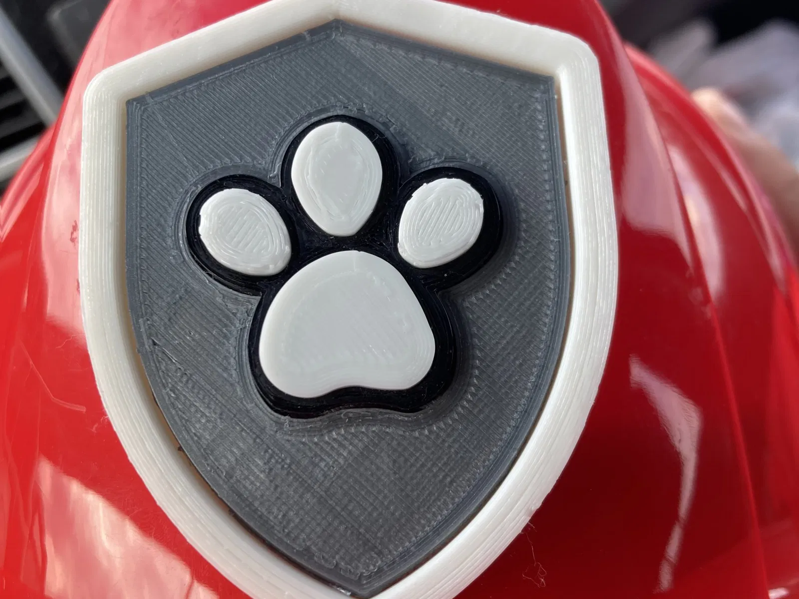 Đây là một huy hiệu Paw Patrol mà tôi thiết kế để gắn vào mũ của lính cứu hỏa để con tôi có thể trở thành Marshall trong Halloween. Huy hiệu có 4 phần. Một “tấm chắn” được dán trực tiếp vào mũ bảo hiểm. Một “tấm chắn bên trong” được dán vào “tấm chắn” chính và có một lỗ cắt cho phần chân. Sau đó là một “đường viền chân” và một “chân bên trong”. Tôi thiết kế điều này thành các mảnh riêng biệt để có thể dễ dàng in với các màu sắc đúng. Màu sắc tôi sử dụng là Bạc, Trắng và Đen. Khi lắp ráp, tôi đã dán “tấm chắn” vào mũ bảo hiểm bằng keo epoxy và khi đã gắn chặt, tôi đã sử dụng keo siêu dính để gắn các mảnh còn lại vào “tấm chắn” đã ở vị trí. “Tấm chắn” cũng có một lỗ để mọi thứ có thể được thử lắp và “tấm chắn bên trong” có thể dễ dàng được tháo ra để lắp ráp cuối cùng.