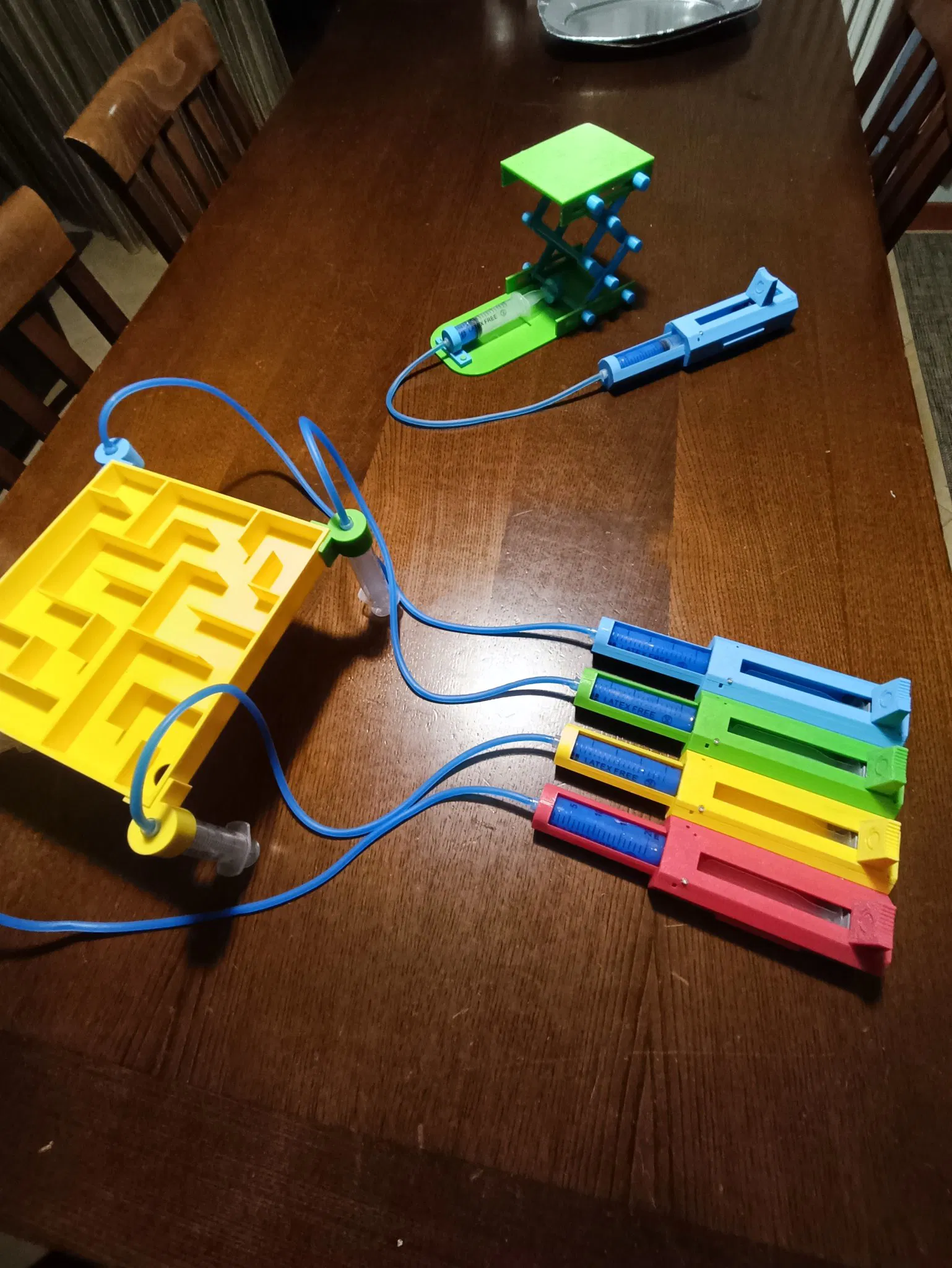 Một mê cung di chuyển dựa trên 4 ống tiêm 20ml làm piston. Để điều khiển các ống tiêm, cần in cả mô-đun điều khiển. Bảng điều khiển cho các công cụ thủy lực với ống tiêm