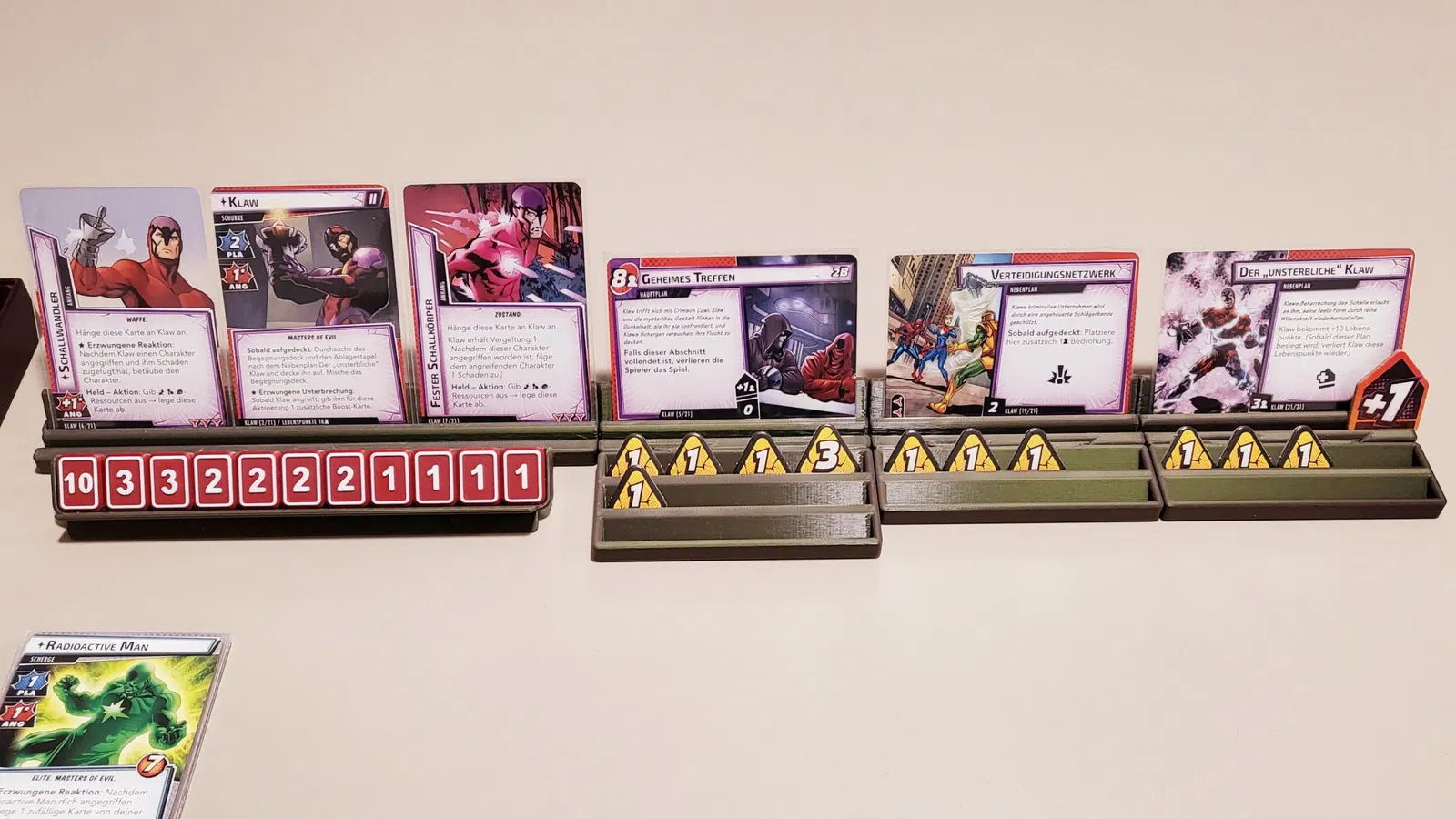Điều này là gì Marvel Champions thường yêu cầu một chút không gian trên bàn, đặc biệt khi chơi với hai hoặc nhiều người chơi. Và, tùy thuộc vào ánh sáng, thẻ được bọc đôi khi khó đọc do phản chiếu. Những giá đỡ thẻ này giúp giảm bớt nỗi lo về không gian và khả năng đọc của tôi. ### Cách sử dụng chúng Sử dụng chúng rất đơn giản: Đặt thẻ vào rãnh ở phía sau cùng. Xong! ^_^ Các giá đỡ có ba kích thước khác nhau: một cái lớn có thể giữ 3 thẻ đứng, một cái kích thước trung bình có thể giữ 2 thẻ đứng và một cái nhỏ có thể giữ một thẻ nằm ngang. Tôi chủ yếu sử dụng cái lớn hơn cho thẻ phản diện và cái nhỏ cho thẻ kế hoạch. Có một vài tính năng bổ sung: - Rãnh đủ rộng để giữ những chồng nhỏ lên đến bốn thẻ. Điều này rất tiện lợi cho các kế hoạch nhiều giai đoạn.